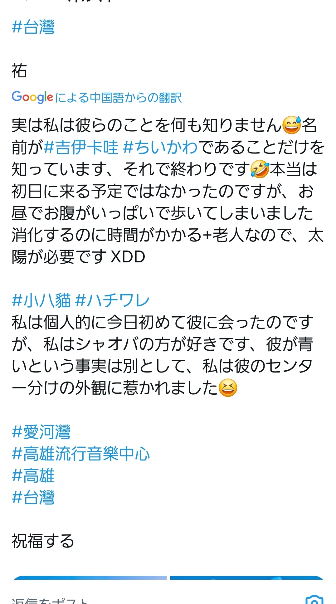 @YiGWu 初めてハチワレをみた台湾人のツイートがかわいかった https://t.co/eG5DedhTKb