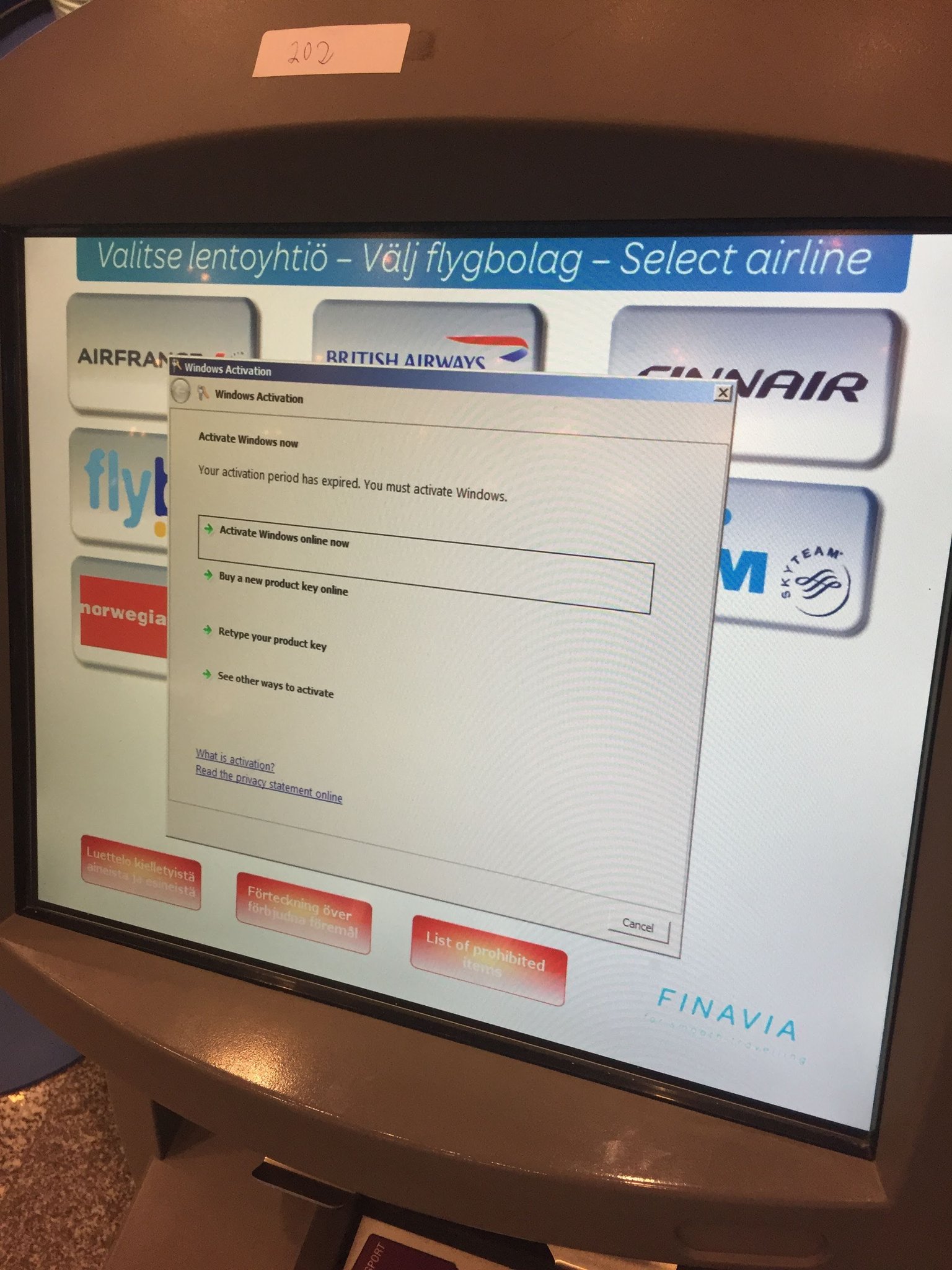 BSODは偶発的だから、まだよいけど、空港のチェックイン端末のwindows がライセンス切れしてたら、不安になった。 https://t.co/6hinI6lfnx