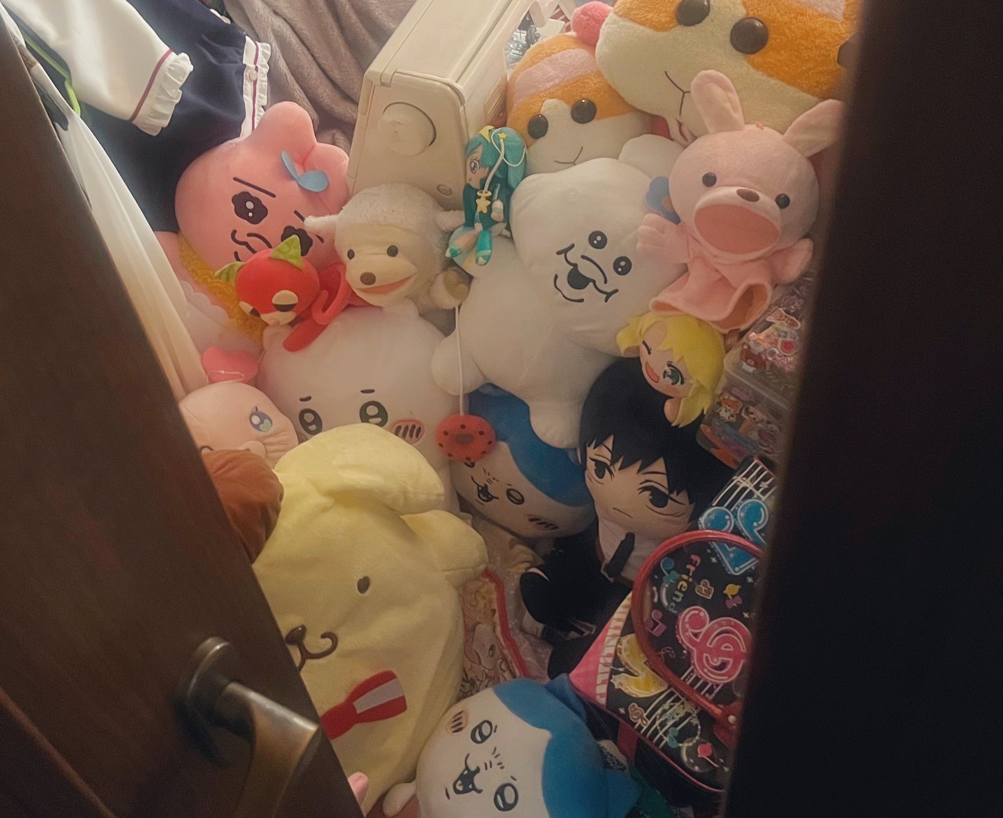 空き巣に入られたんだけど、大量のぬいぐるみで入口が埋まってて半分しかドア開けれないおかげで、部屋の前まで来てた泥棒と鉢合わせせずに済んだのヤバすぎる。コイツらに命救われた https://t.co/HEWlZsmeON