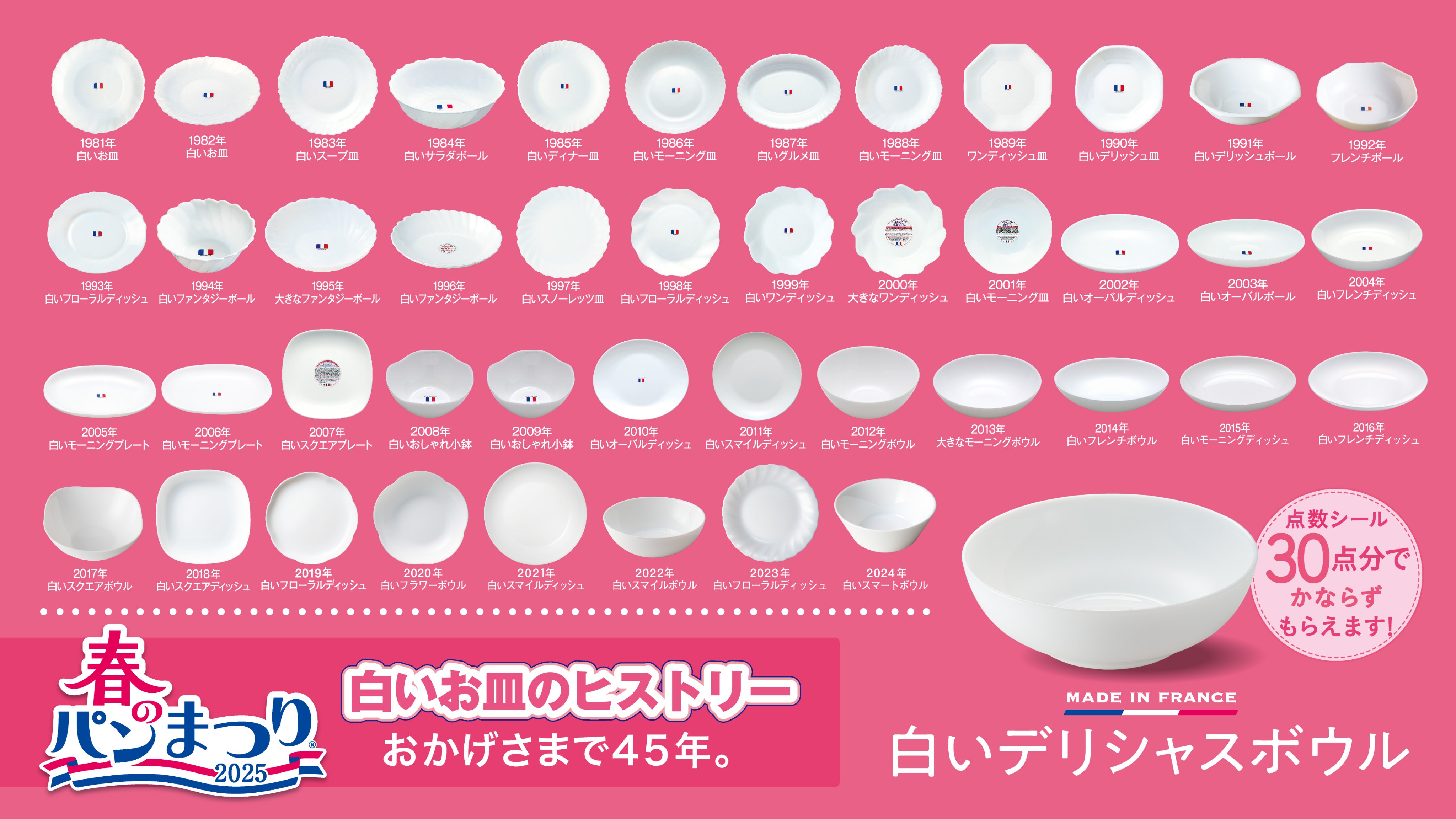 \歴代のお皿がズラリ👀/1981年にスタートした #春のパンまつり は、今年で45回目。初回からずっと、フランス製の #白いお皿 をプレゼントしています✨みなさんのお家にあるお皿が何年のお皿か確かめてみてください✅白いお皿をもっとみる🔍https://t.co/KKV3QdKVB4 https://t.co/0ZPMc3683T