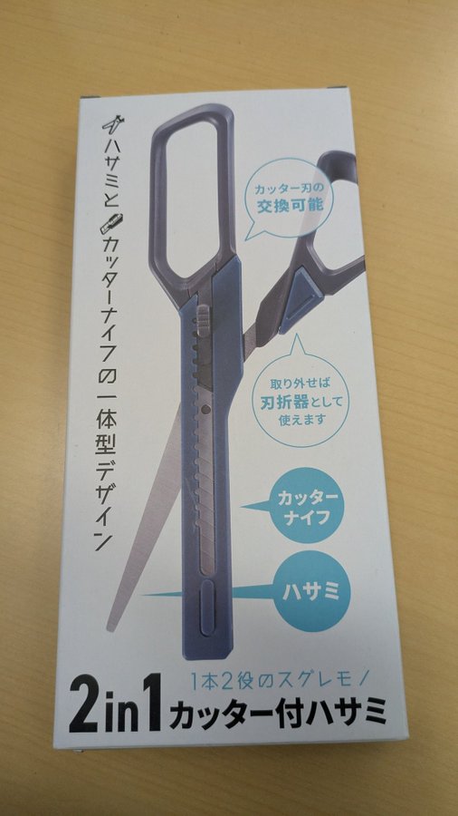 カッターナイフとはさみが一つになったとかいう謎の便利グッズ、微妙なアホさが気に入って買ってみたら燦然と輝くバンナムロゴ https://t.co/ZvoerywtvQ