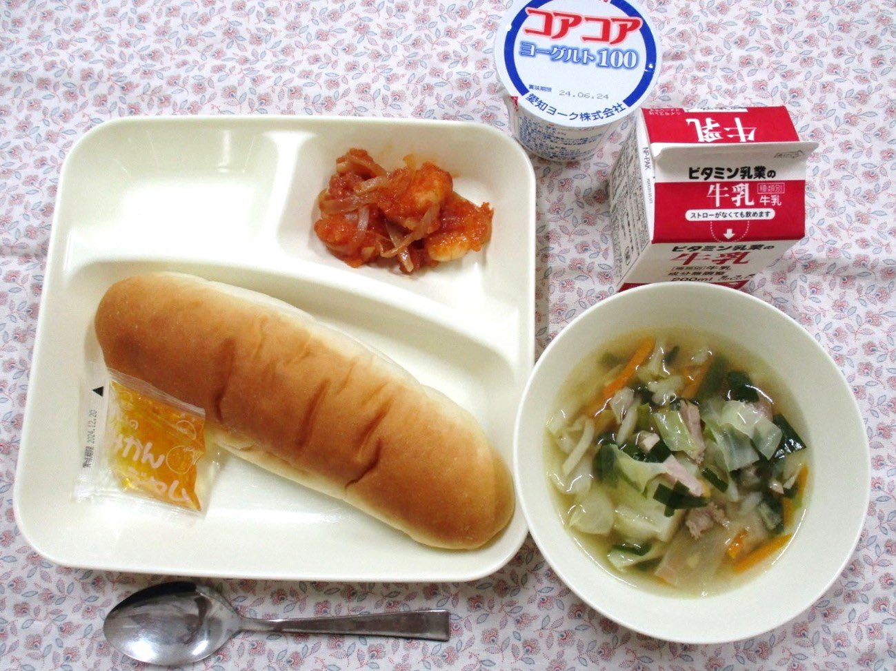 どこの自治体なんだろう。地域差がひどい。野菜ないし、こんな機内食の軽食で配られるパンみたいなの見たことない。