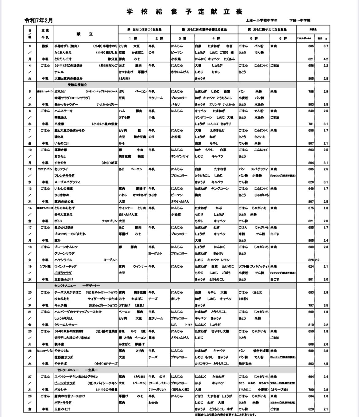 子供達の学校はけっこう頑張ってくれてたんだなーと思う。献立表にカロリーも書いてあった。この給食はどのくらいなんだろ。年度末の調整は、どっかの学年がデザート追加になる、とかならあった。