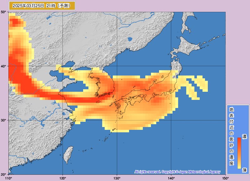 すごい黄砂飛来が3/25に予想されています。最新の気象情報にご留意ください。 https://t.co/GCjUoDEBER