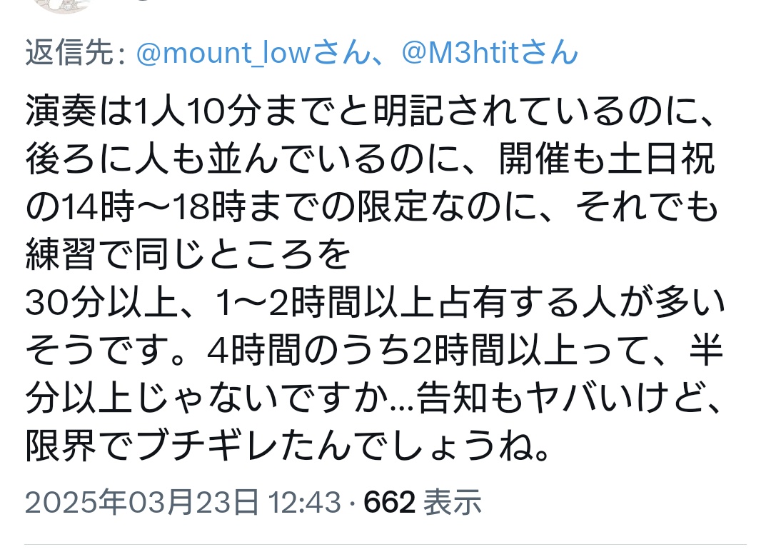 普通に「練習のために長時間のご利用はお控え下さい」とか注意喚起でいいはずなのに、「正直な気持ち」「書かなきゃいけないなんて」「つっかえずに弾けるようになったら」「誰かに届いてこそ」とか余計な主観を入れて話す上、しまいには「たまったもんじゃない」とか…撤収した方がいいと思う