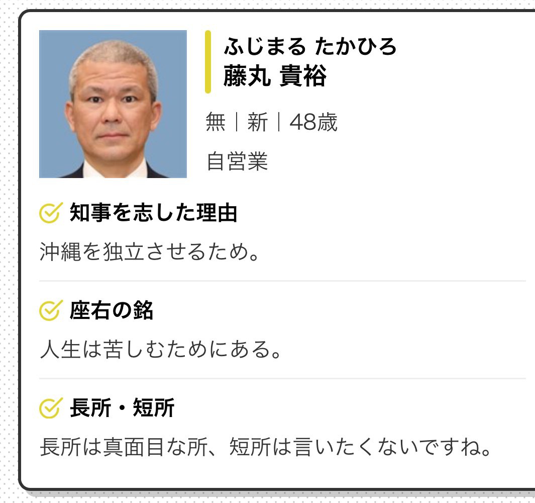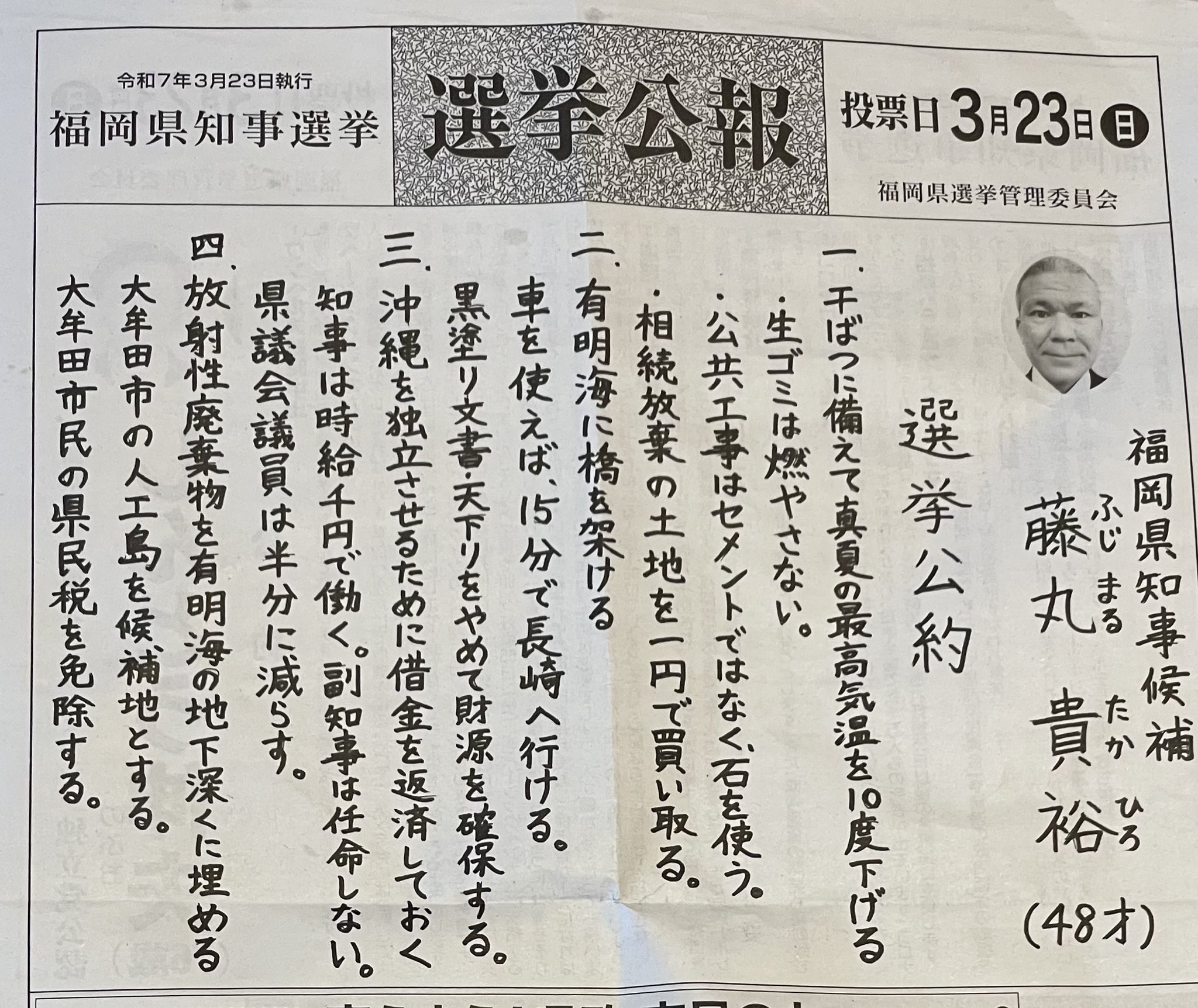 候補者全員載ってる選挙公約一覧みたいなチラシに、この人だけ手書きで「沖縄を独立させる」だの、他にも意味のわからんこと大量に書いてあって笑った記憶