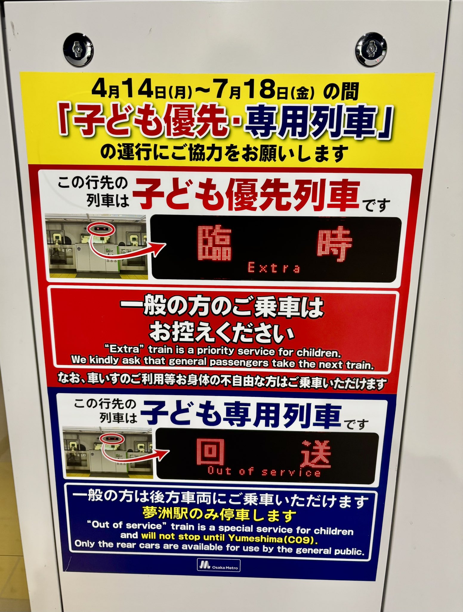 これ逆じゃないか?優先 (臨時) →子ども優先(一般人も可)専用 (回送) →子どもだけ乗れるの方が分かりやすい気がするんやけど。てか、そもそも分かりにくい列車やな、、、