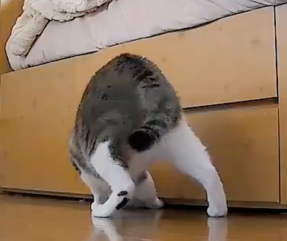 昔の見守りカメラの録画に「チュールを盗んでウキウキになってたらベッドの下にシュートしてしまい慌てふためく猫」を見つけて笑ってる。おもしれー猫。 https://t.co/uIlUzz8vHM