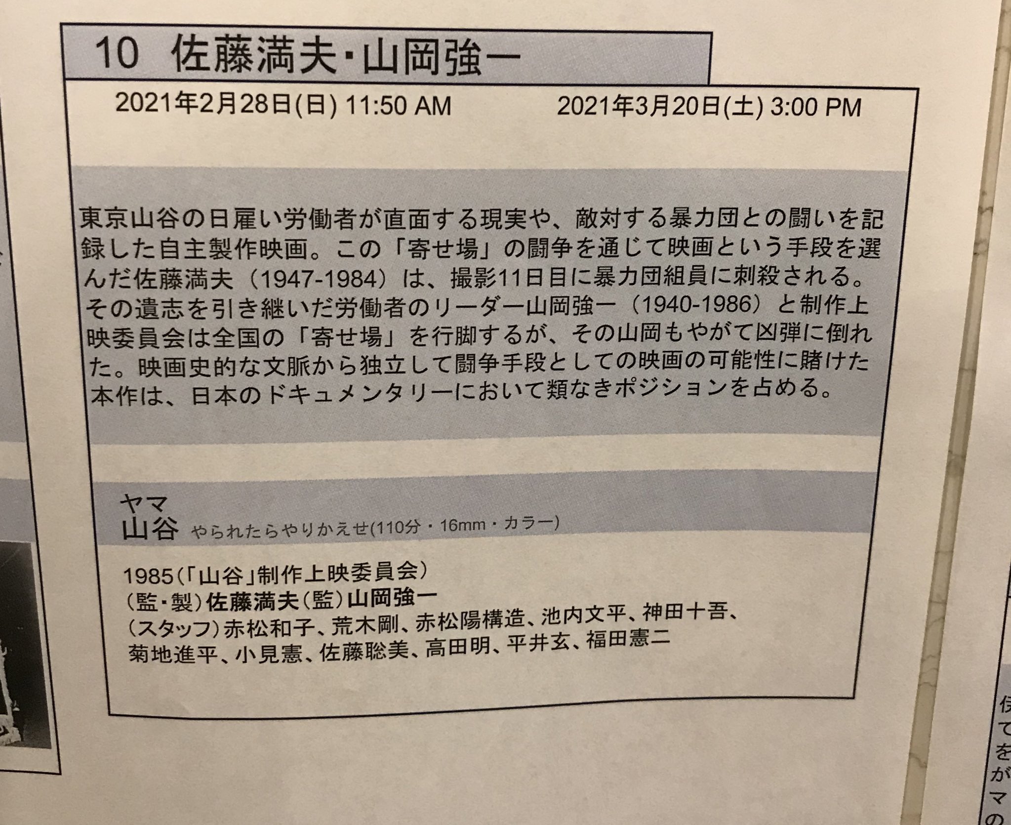 #お前もうそれ撮れないだろ選手権撮影中に監督がヤ○ザに殺され、その後引き継いだ監督も完成後に殺されたためDVDをはじめソフト化が不可能な映画『山谷やられたらやりかえせ』 https://t.co/WTSOSFOEI6