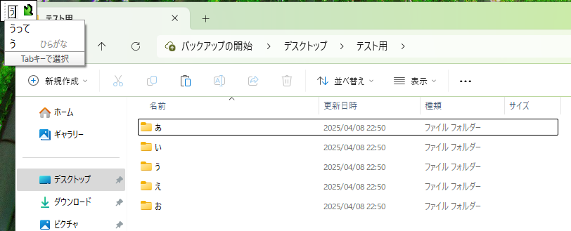 一つのフォルダに3桁くらいファイルがあった時にそれでファイル名を入力して探す、個人的に必須な機能。ちなみに日本語入力時に発生する、アルファベット入力時は変換窓無しに打たれた文字の順に選択カーソルが移動。