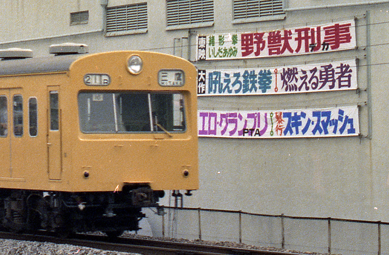 @tokati_hide 緩行線の101系含め、手書きの布サイン、映画のタイトルなどすべてに時代感が詰まっていますね…!