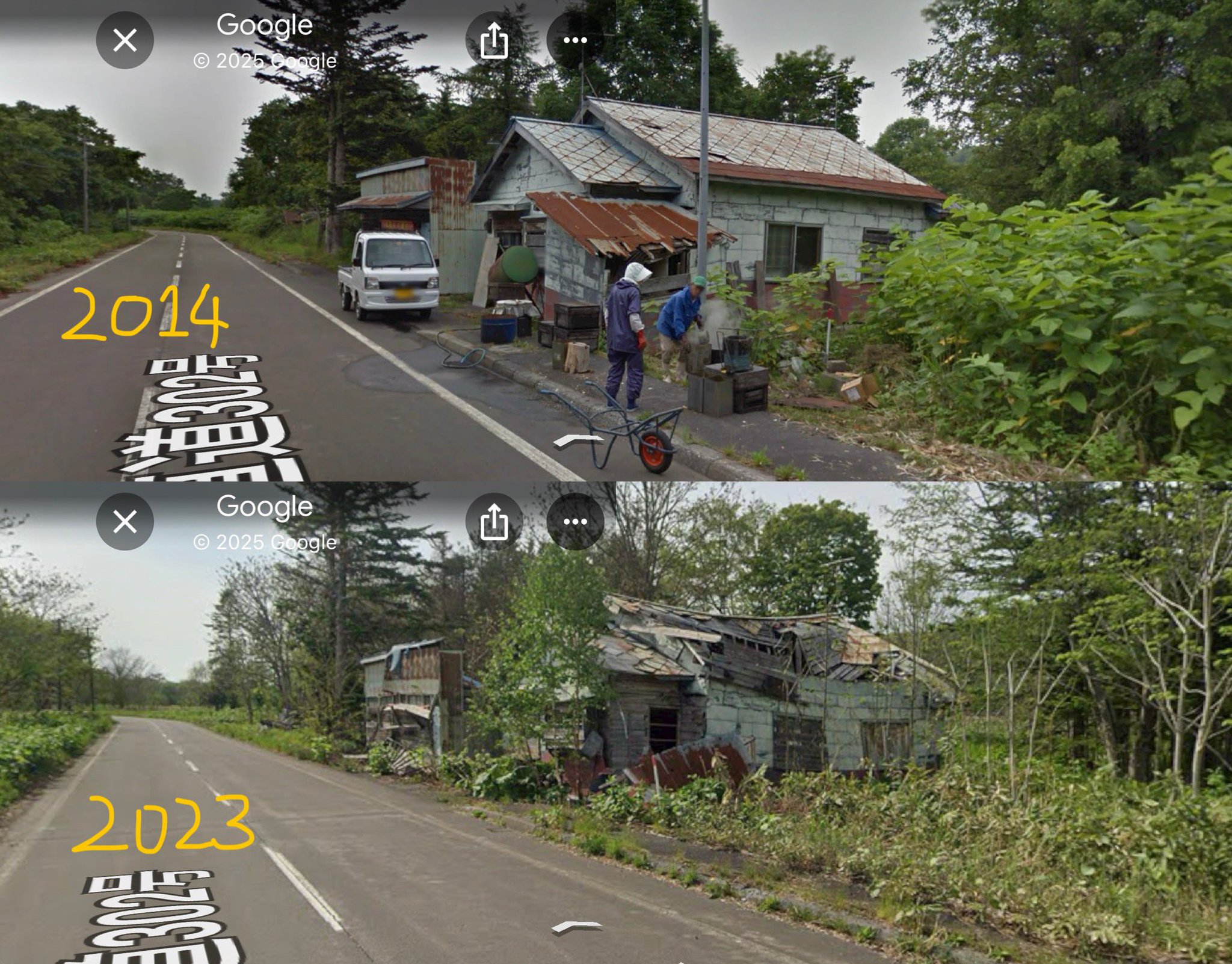 @hopigon 2014は道の先に高圧の電線引いてからまだ住んでる家があったのですね。2023は電話線が両家から外され、空き家になってますね。