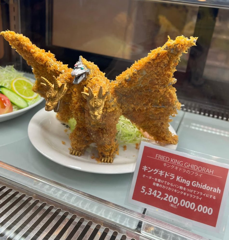 キングギドラの画像調べてたら、ふざけたの発見したんだが💦これ2023年に、愛知県のジブリパーク付近にある、ららぽーとのレストランのショーケースに飾られてたジョークらしいね🫢…..純粋に欲しいんだが、このフライメカキングギドラ🤭 https://t.co/FZxIuxwDoK