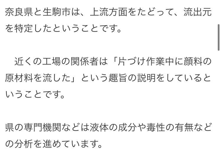 @paint_happyend 近くの工場の関係者は「片づけ作業中に顔料の原材料を流した」という趣旨の説明をしているということです。どこの企業?日本じゃないだろ。
