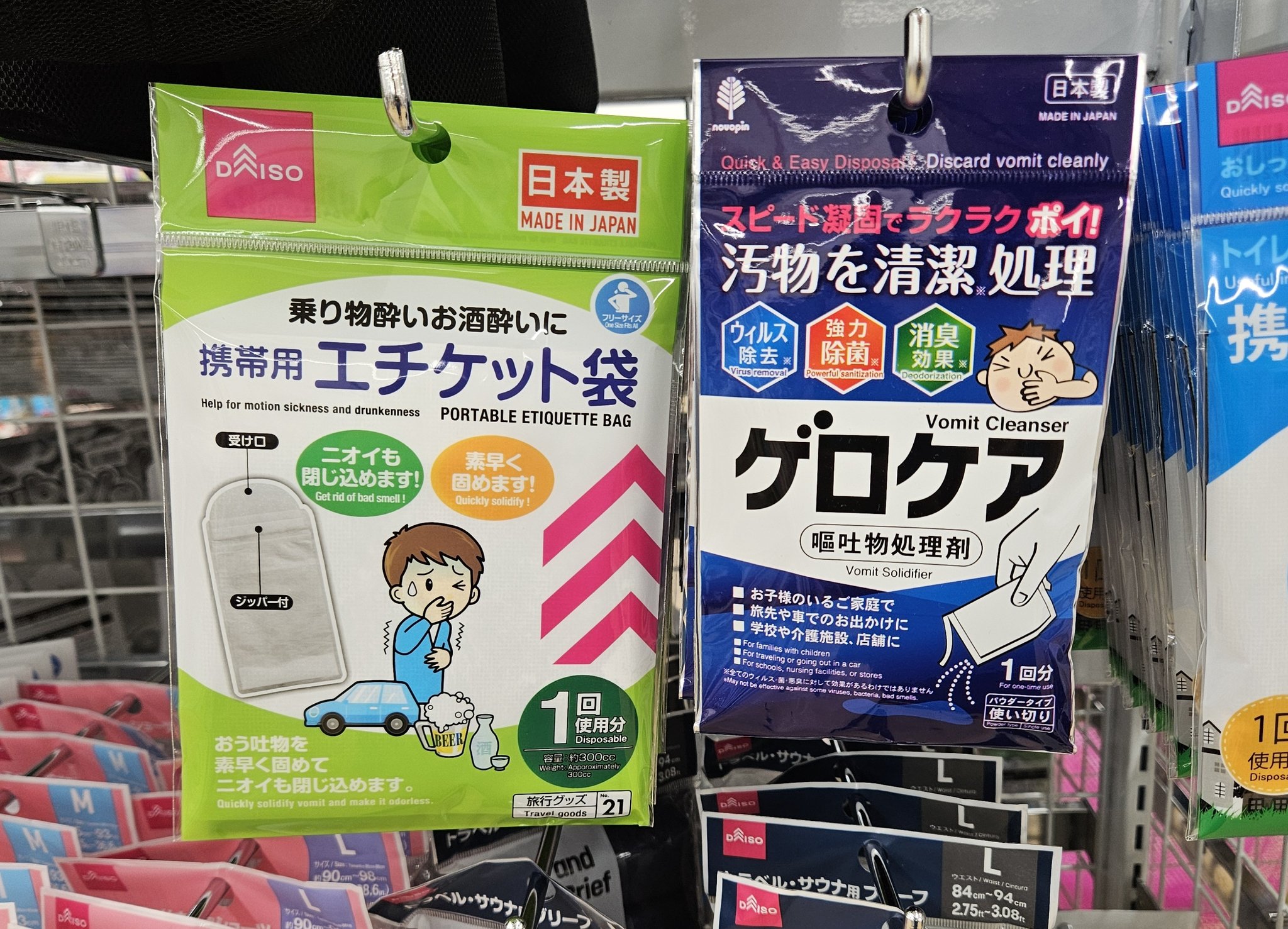 @newkotorizm これ実は用途が違うんですよねエチケット袋の方はその袋に吐き出す用途一方gero-care(ネイティブ発音)の方は嘔吐した吐瀉物にかけて凝固・処理する粉なのでエチケット袋にネーミングを寄せてしまうと使用方法を間違えてしまう可能性があるのであえてド直球な名称にしている頭脳プレーかもしれない