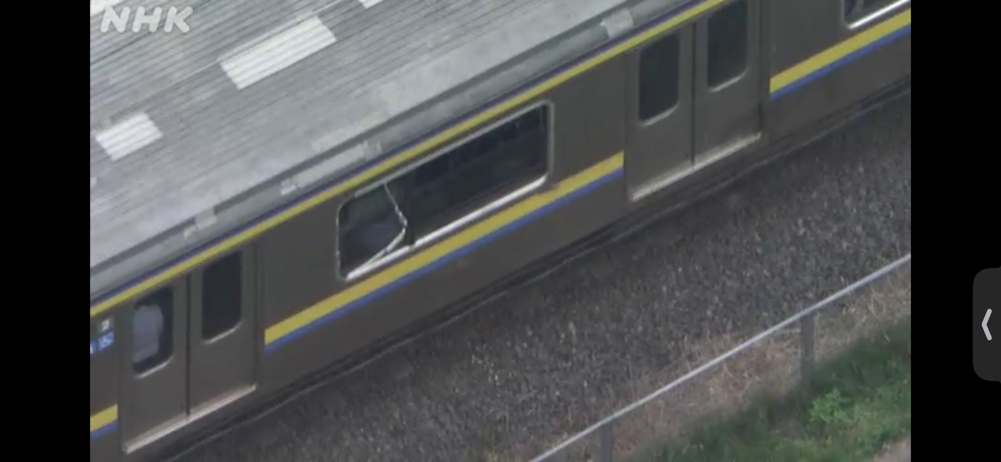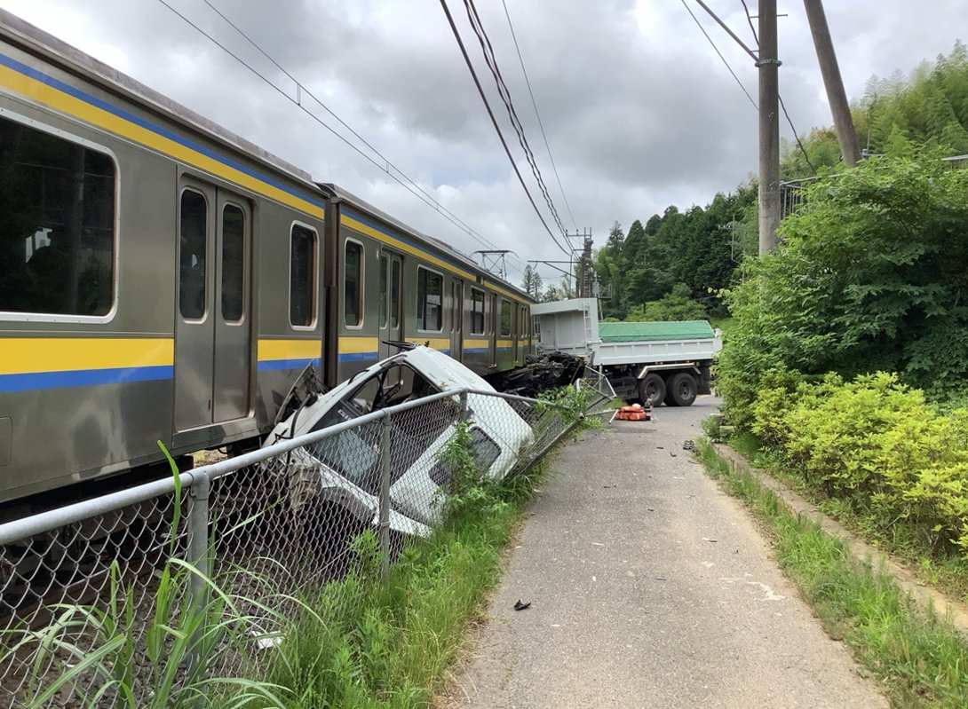 NHKによる上空からの様子ですがかなり損傷が激しい模様です。側面のドアが事故により変形しています。 #踏切事故 #総武本線 https://t.co/hDMFV5Ag3f