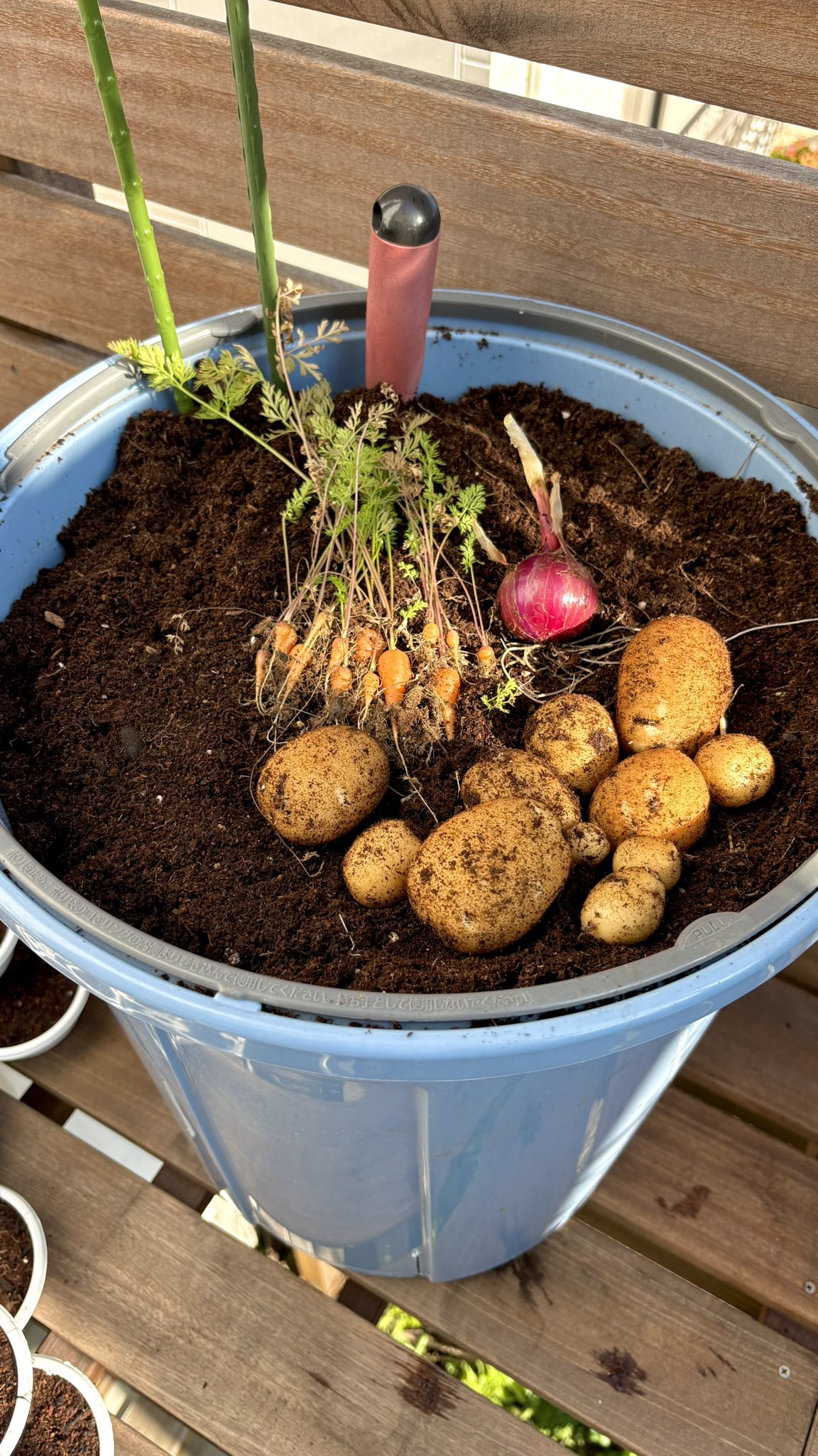 結論。「業務用ゴミ箱でカレーの具材を同時に育てると、じゃがいもが全ての日の光を独占して玉ねぎ・人参が嫌な思いをする」ことがわかりました。#業務用ゴミ箱栽培 https://t.co/t1pJI6g2LK