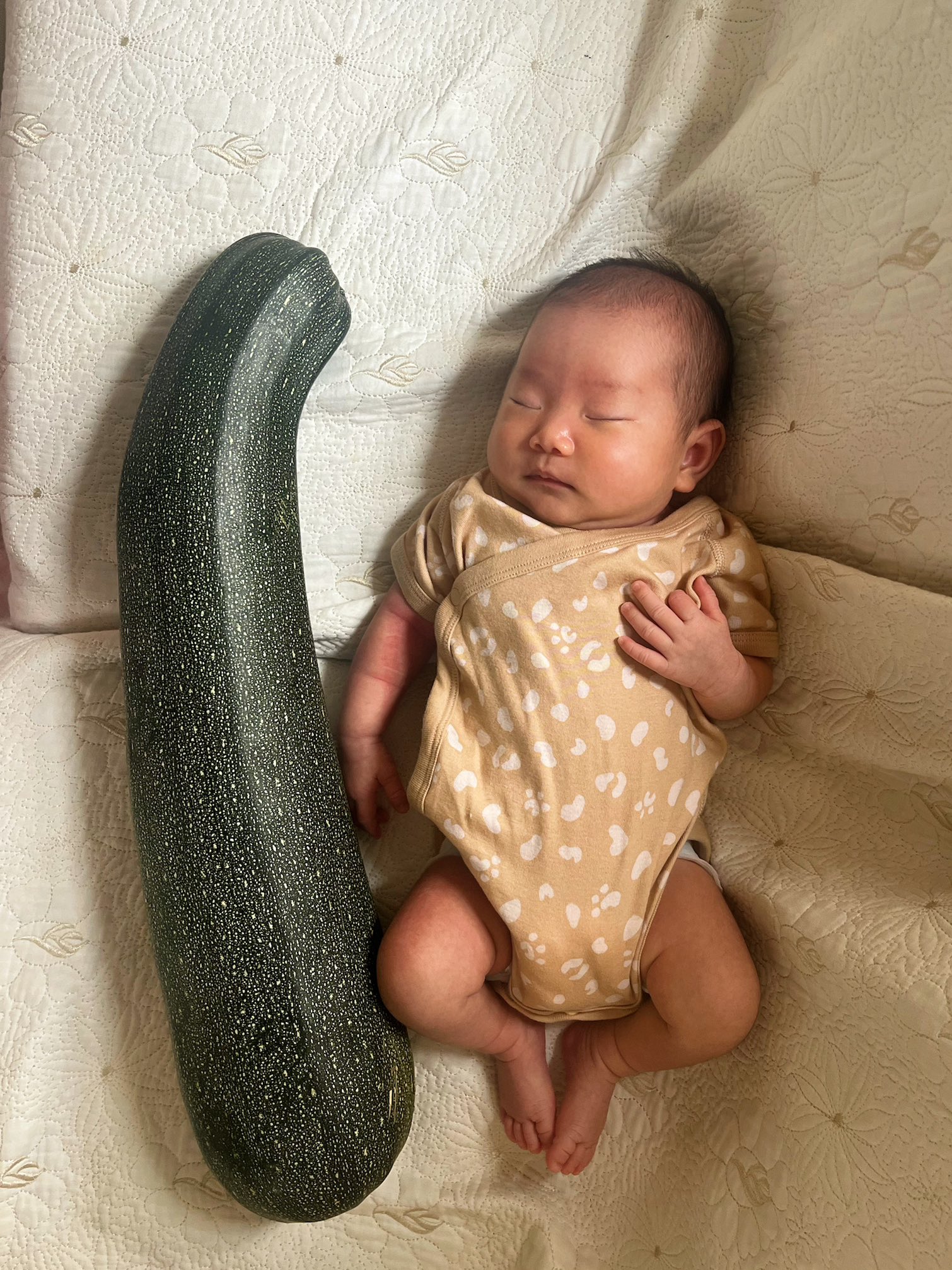 新生児が小さいのかズッキーニが極端にデカイのかわからないけど和む。