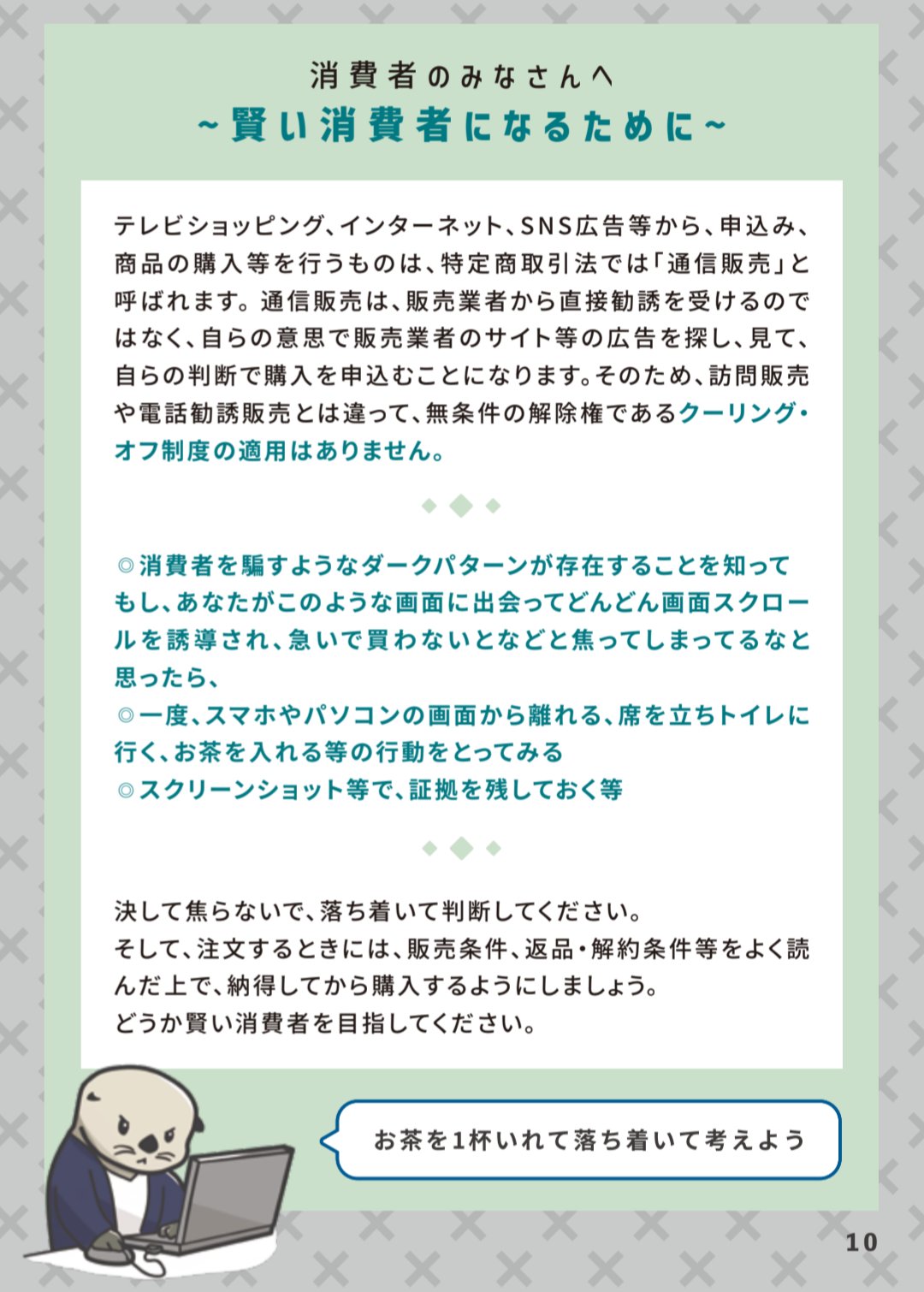 おっ動物キャラだ、と反射的に手に取ったものですが、イラストを見れば見るほど動物へのこだわりが垣間見えて只者ではないなと感じました。イラストだけでなく、冊子の内容である悪質な通信販売の手口や相談方法も周知されればいいなと思います(上記公式サイトより引用) https://t.co/lpqJQkCQjh