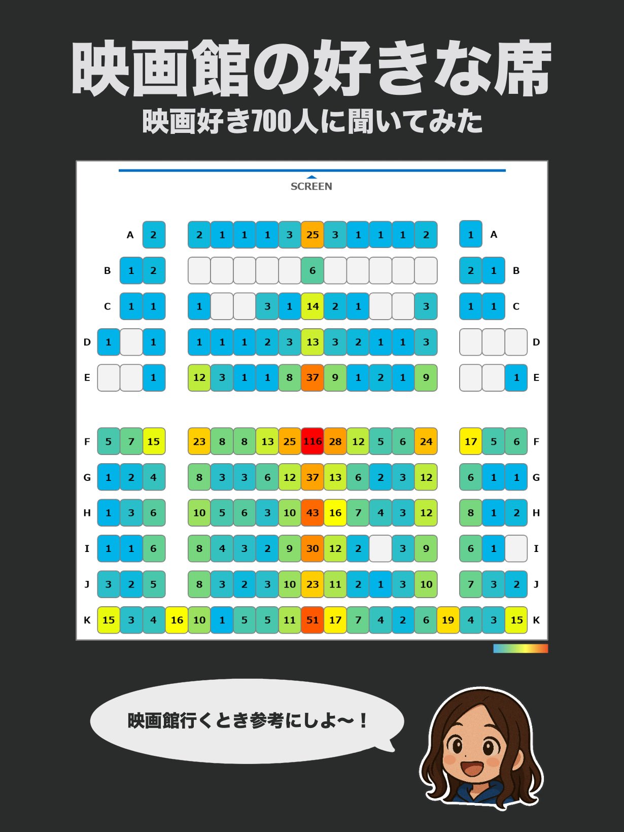 私は映画毎に席選びの画面でスクリーンの大きさ見て判断してる。大きめで見たい派だけど、IMAXレベルの画面サイズで前の方の席だと全体見えないので少し後ろに。特に池袋TOHOのIMAXはすっごいでかい!逆にちっさいスクリーンの時は最前列選んでる。人と行く時はほどほどにしてる🙄