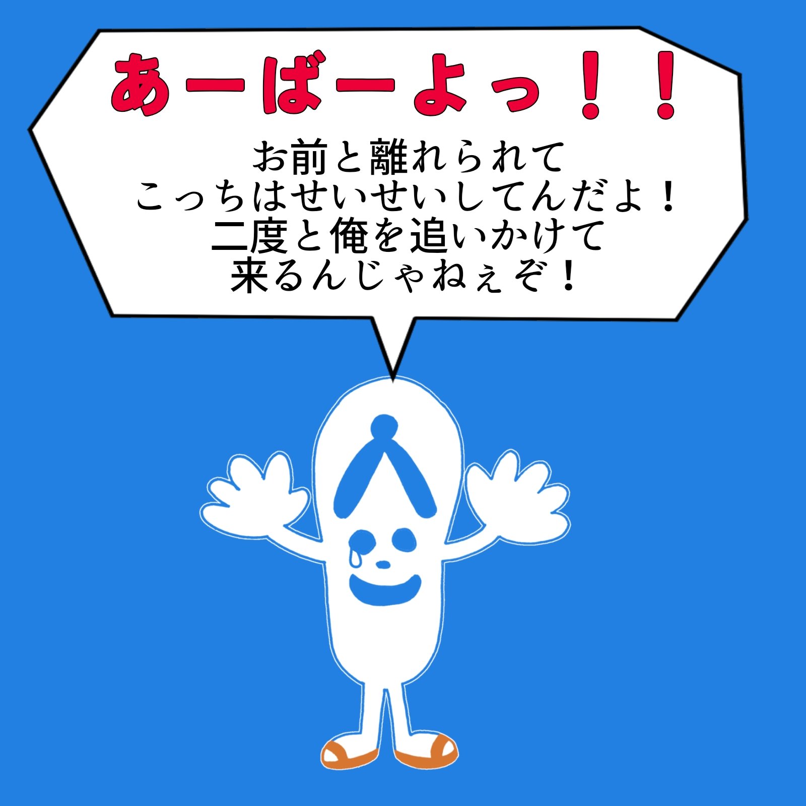 @clothoid_curve サンダルくん「この際だから言うけどよ、俺はな、お前のクサい足が大嫌いだったんだよ!もう二度と俺を追いかけてくるんじゃねーぞ!」(…ひでぇ事言っちまった。でも、こうでも言わないとあいつバカだから…達者でな)