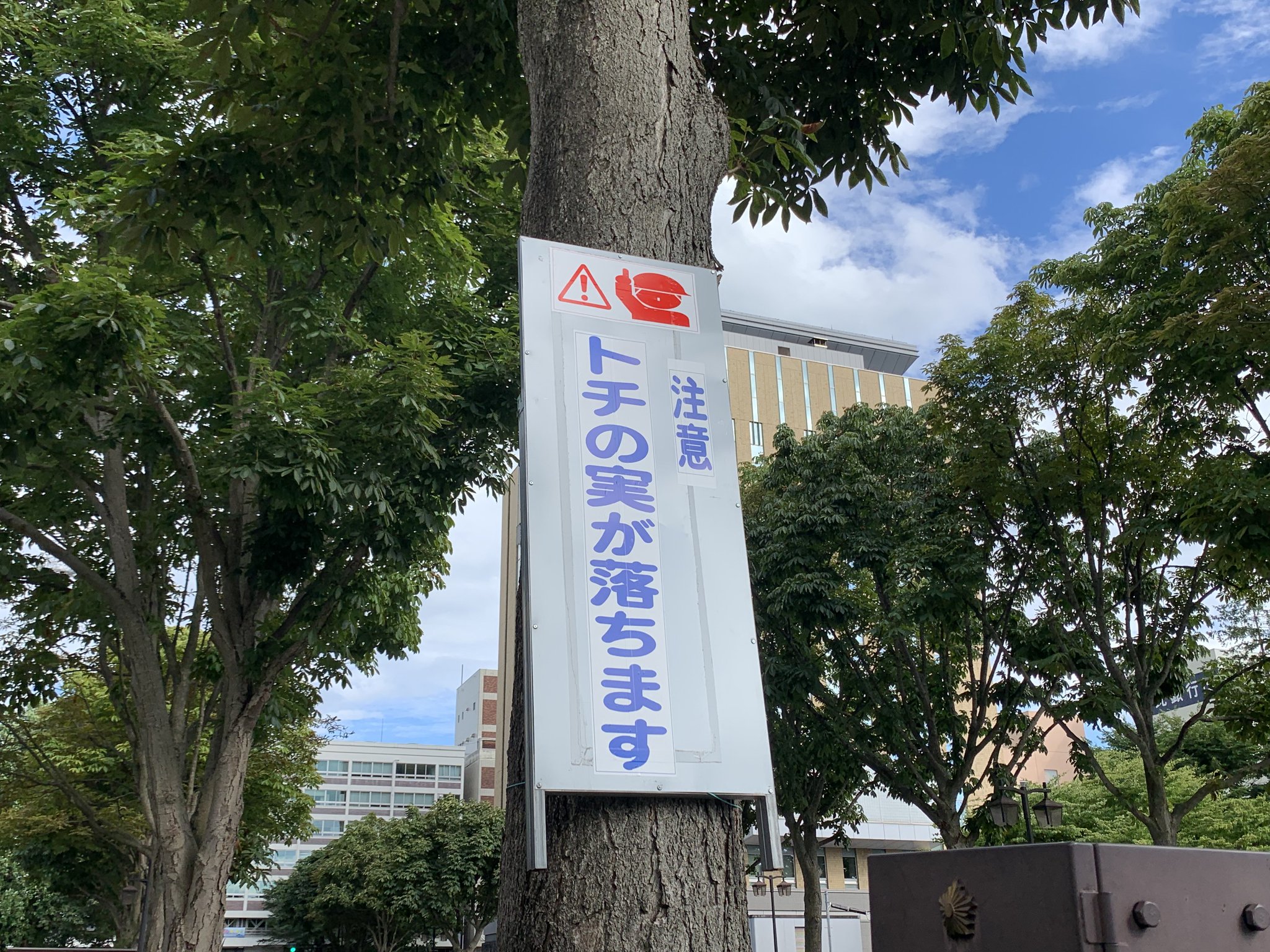 (もりおかメモ)書体が変わった「トチの実が落ちます」看板が登場。なので、内丸はもう秋です。2025.8.9 https://t.co/4kb51IrLcD