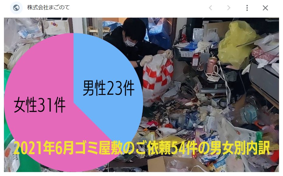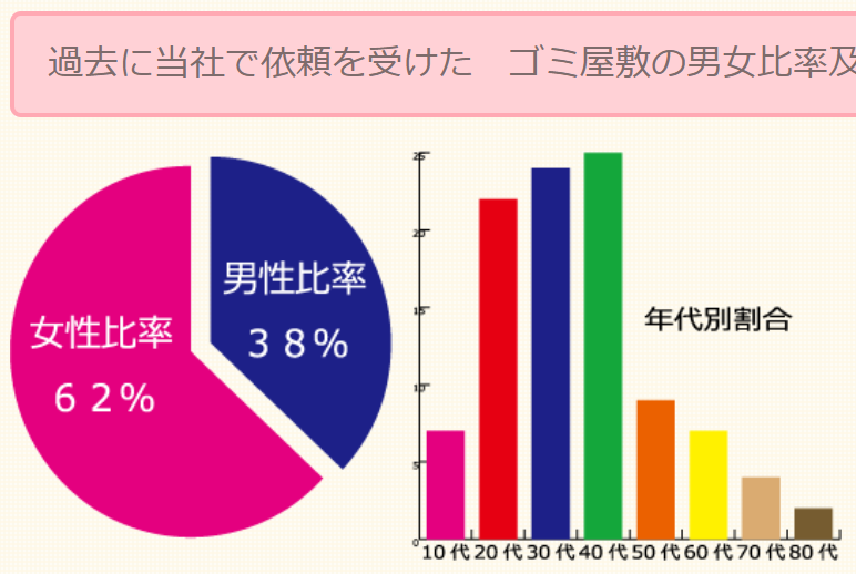 ゴミ屋敷にしてしまうのは不潔だからではなく精神疾患なので、引用元の事情とは異なる気がするあと、ゴミ屋敷の主=清掃会社への依頼人、とするなら、ゴミ屋敷の主の男女比と依頼人の男女比は必ずしも一致しないのではないかという気するまあどっちでもいいけどね