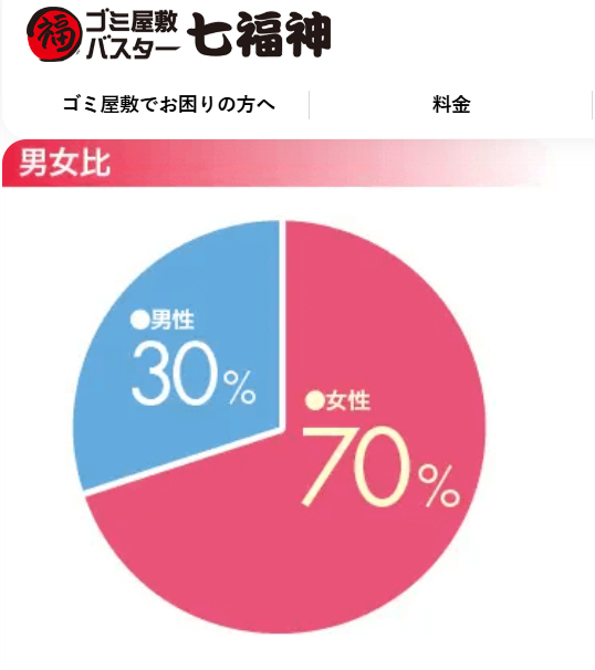 どうせ日本女性の嘘松でしょうが、データを提示しましょう。ゴミ屋敷の片付け業者の統計では、ゴミ屋敷の男女比は7:3で女性のほうが多い。(画像は異なる3社の統計ですが、ものの見事に同じような結果になっています)一人暮らしの男女比が7:3で女性少数であることを考えれば圧倒的な女性率です。 https://t.co/cnGv3xIVWy
