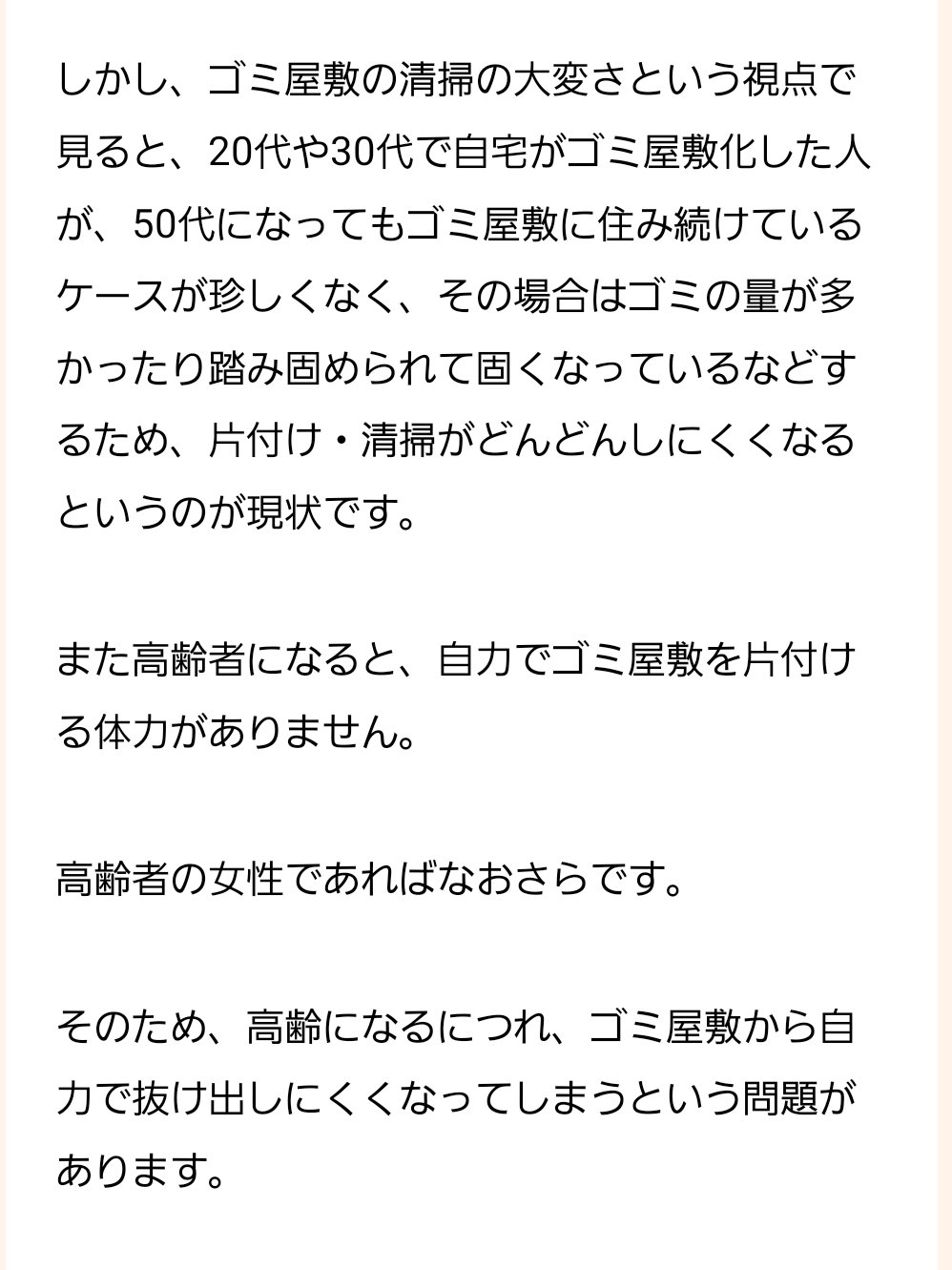 片付け業者のサイトから引用させていただきますが、少なくとも片付け業者は「依頼者=ゴミ屋敷に住んでる当人」という文脈ですね。ちなみにこの画像の下には「20~30代女性からのご依頼が圧倒的!」というキャプションが付いています。https://t.co/A8GFIB4VSL https://t.co/ZXzgeENtyy