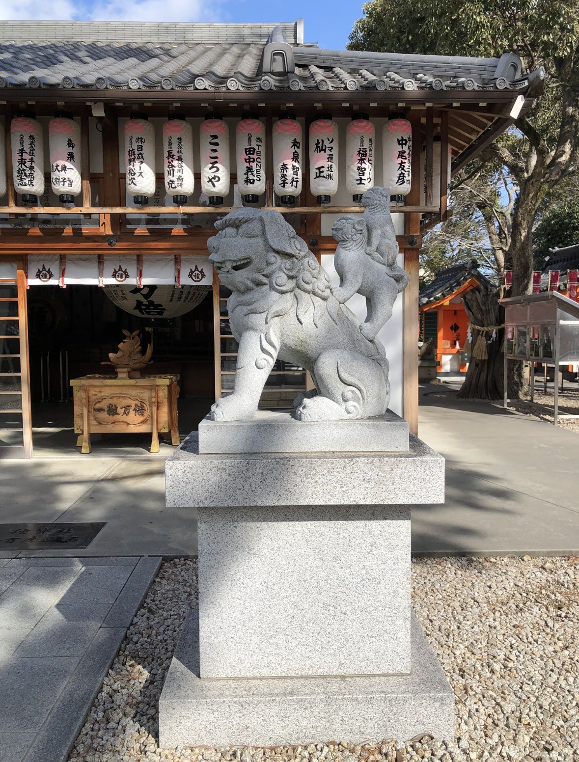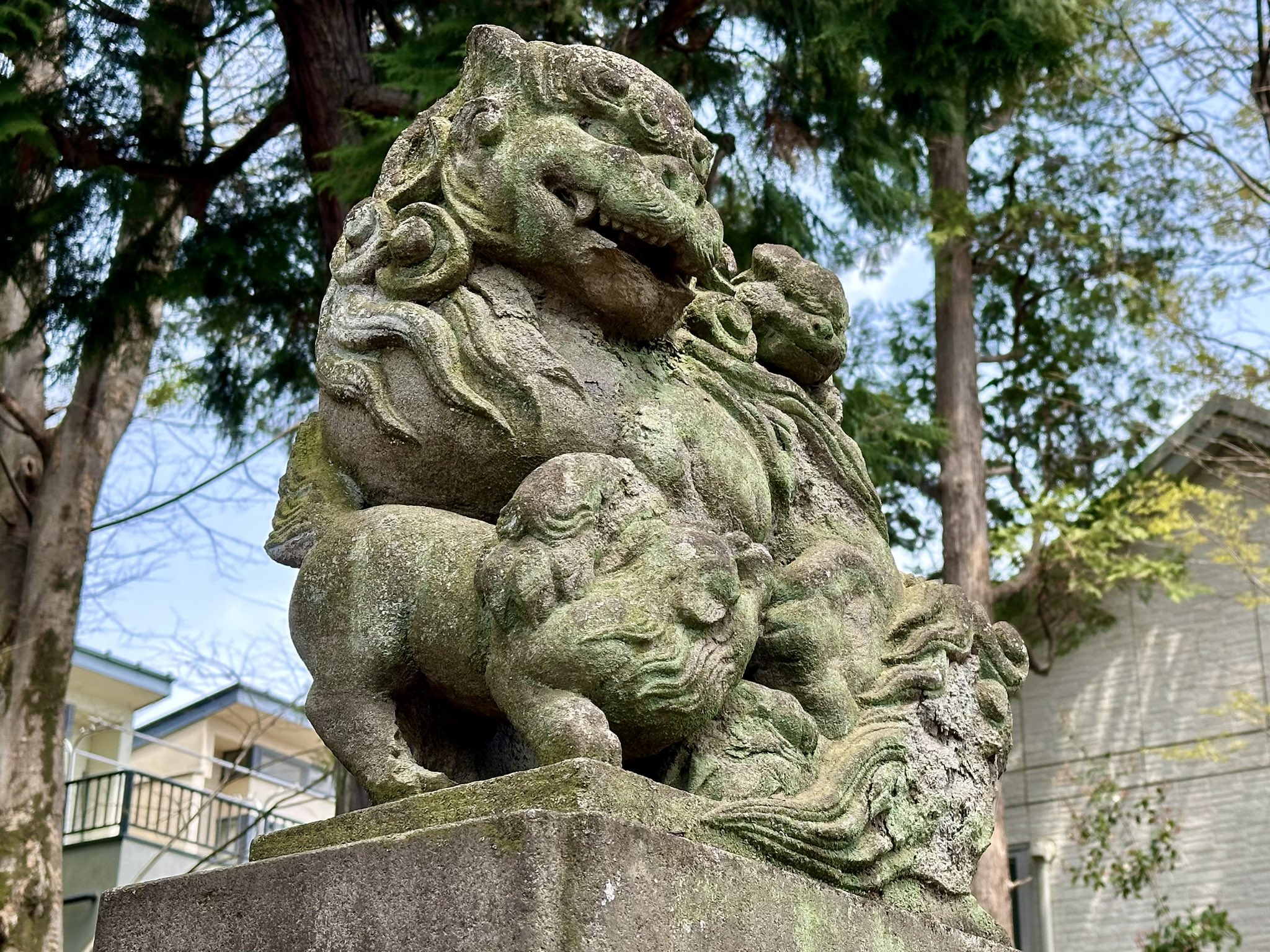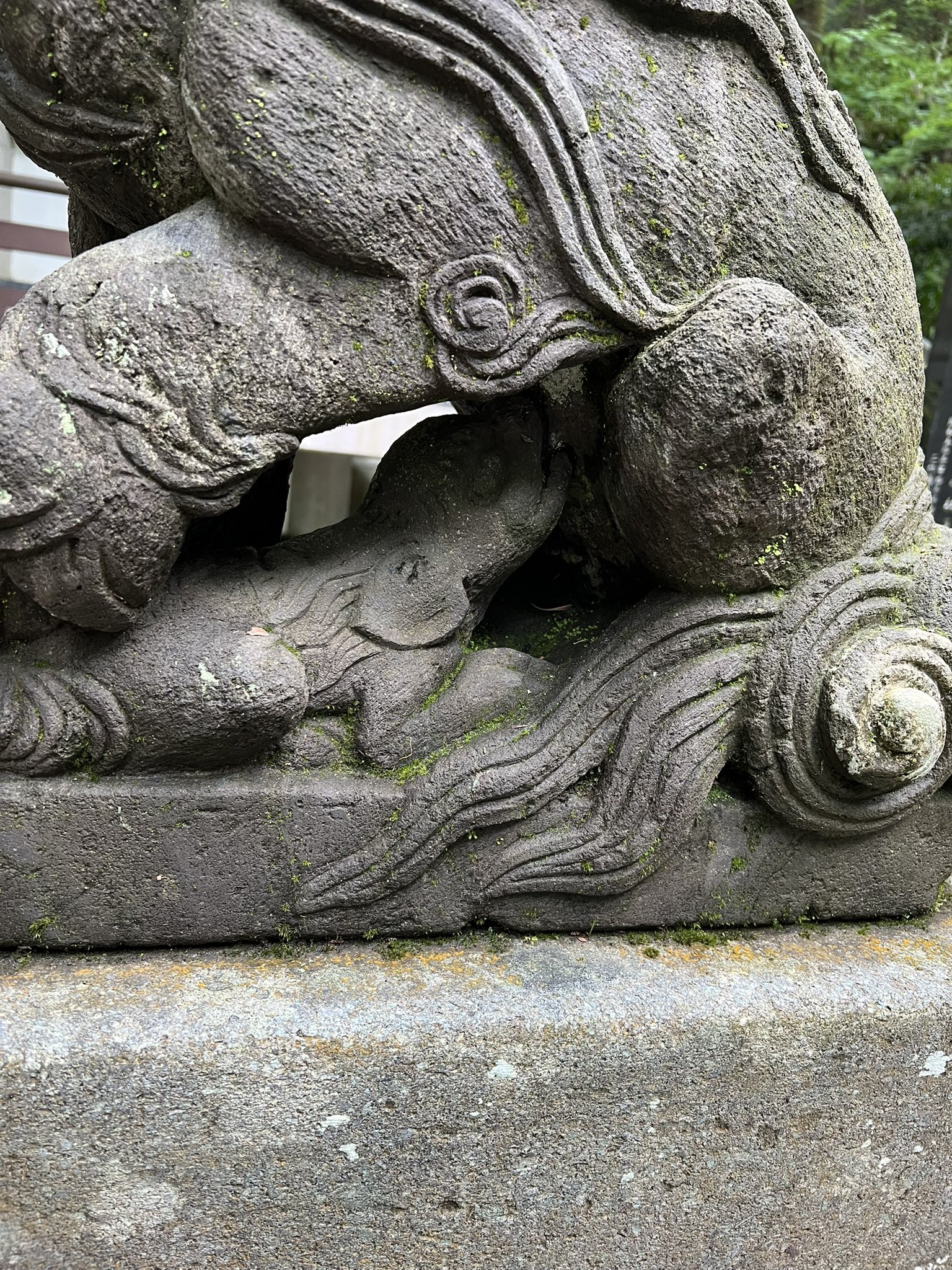 子取り/子連れの狛犬ちゃんには、子宝繁栄の意味合いがあるのだそうで(多分諸説ある)お写真の狛犬はお口を閉じているので阿吽の吽さんです。たまに阿さんでも子を連れてるのを見ますが吽さんのが割合的に多いかな。愛らしいお顔立ちでとっても可愛い!