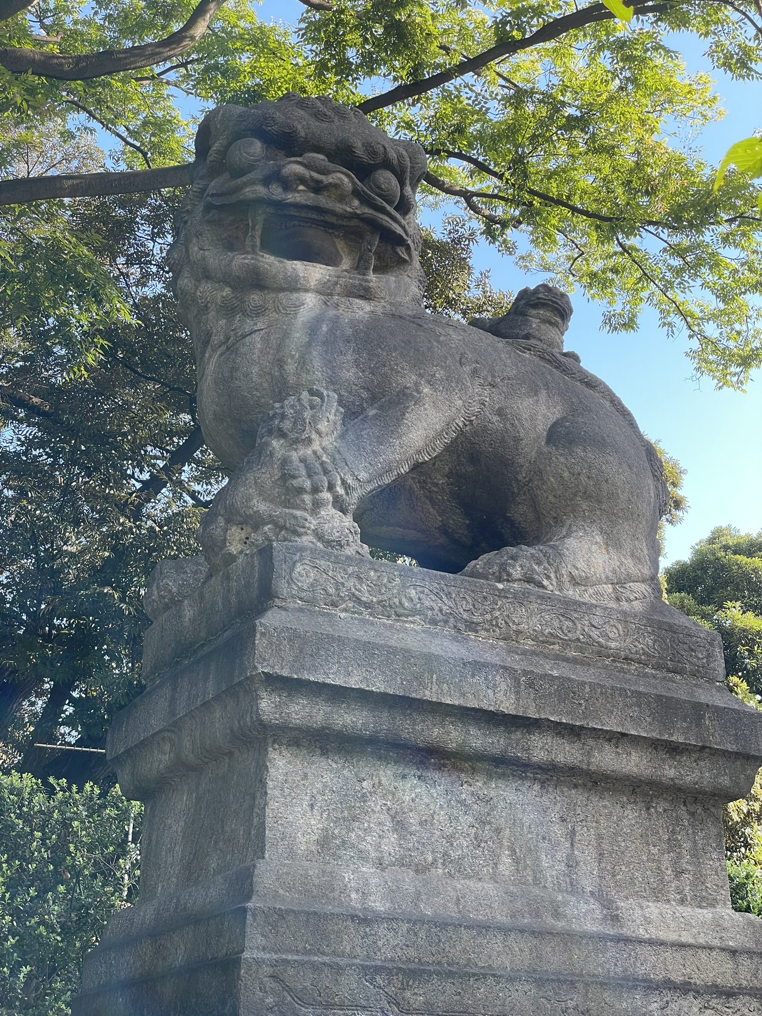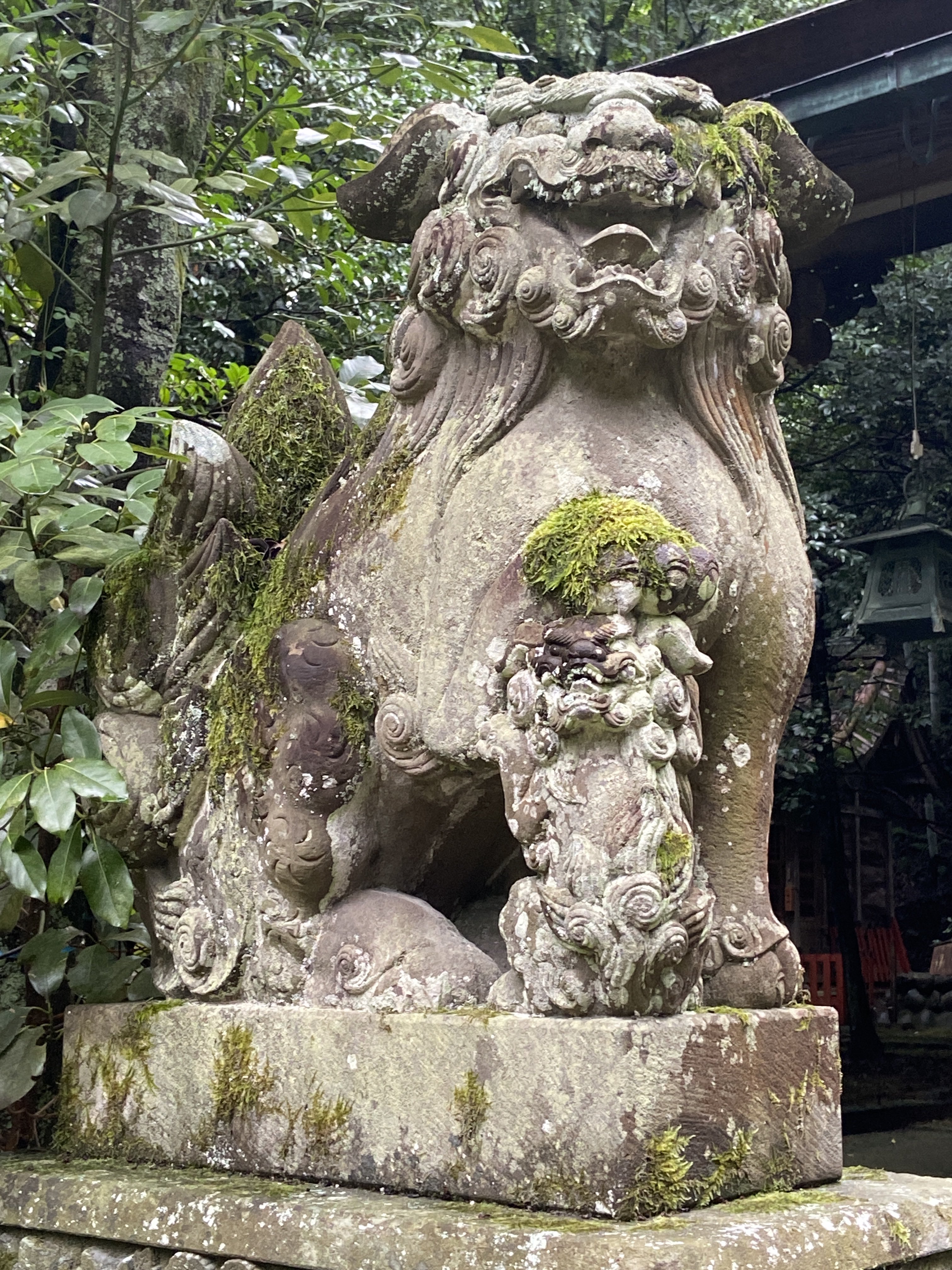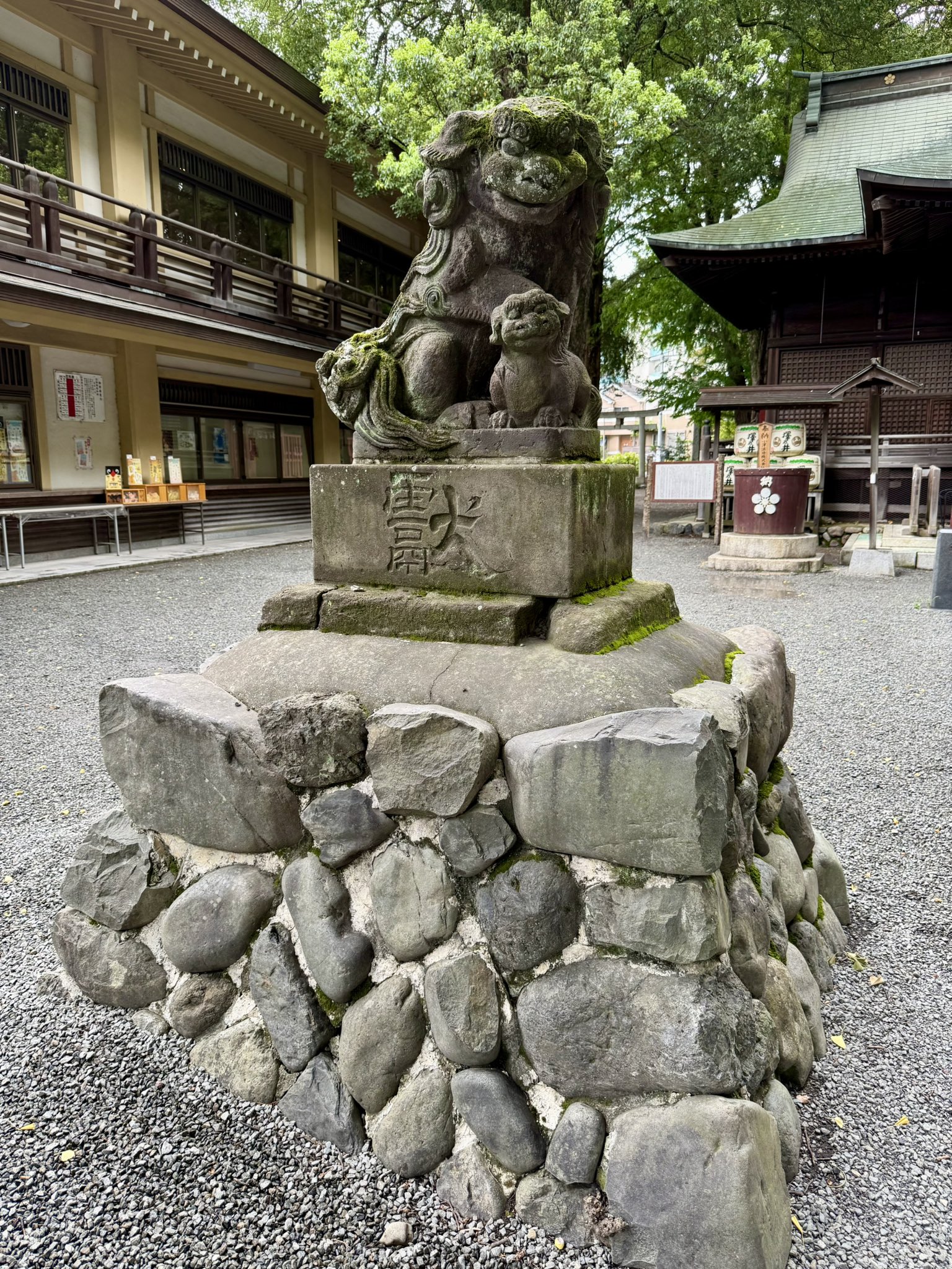 子取り/子連れの狛犬ちゃんには、子宝繁栄の意味合いがあるのだそうで(多分諸説ある)お写真の狛犬はお口を閉じているので阿吽の吽さんです。たまに阿さんでも子を連れてるのを見ますが吽さんのが割合的に多いかな。愛らしいお顔立ちでとっても可愛い!