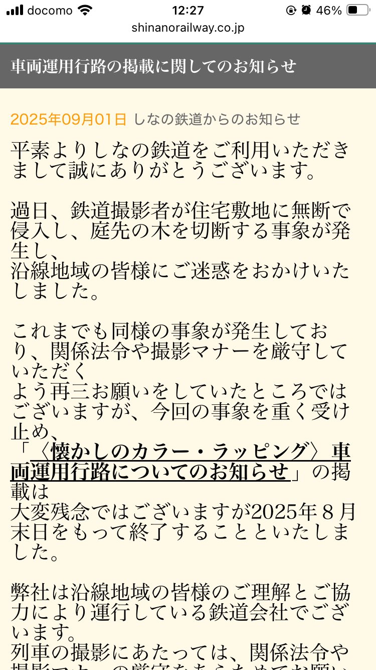 しなの鉄道に関しては過去にも沿線の木を勝手に切る迷惑撮り鉄の問題があってあの時は会社側も温情で対応したので撮り鉄も「排除しないでくれてありがたい」と言ったのを思い出したけど、それでも迷惑行為が積み重なって会社側もとうとう撮り鉄排除に舵を切ったか…