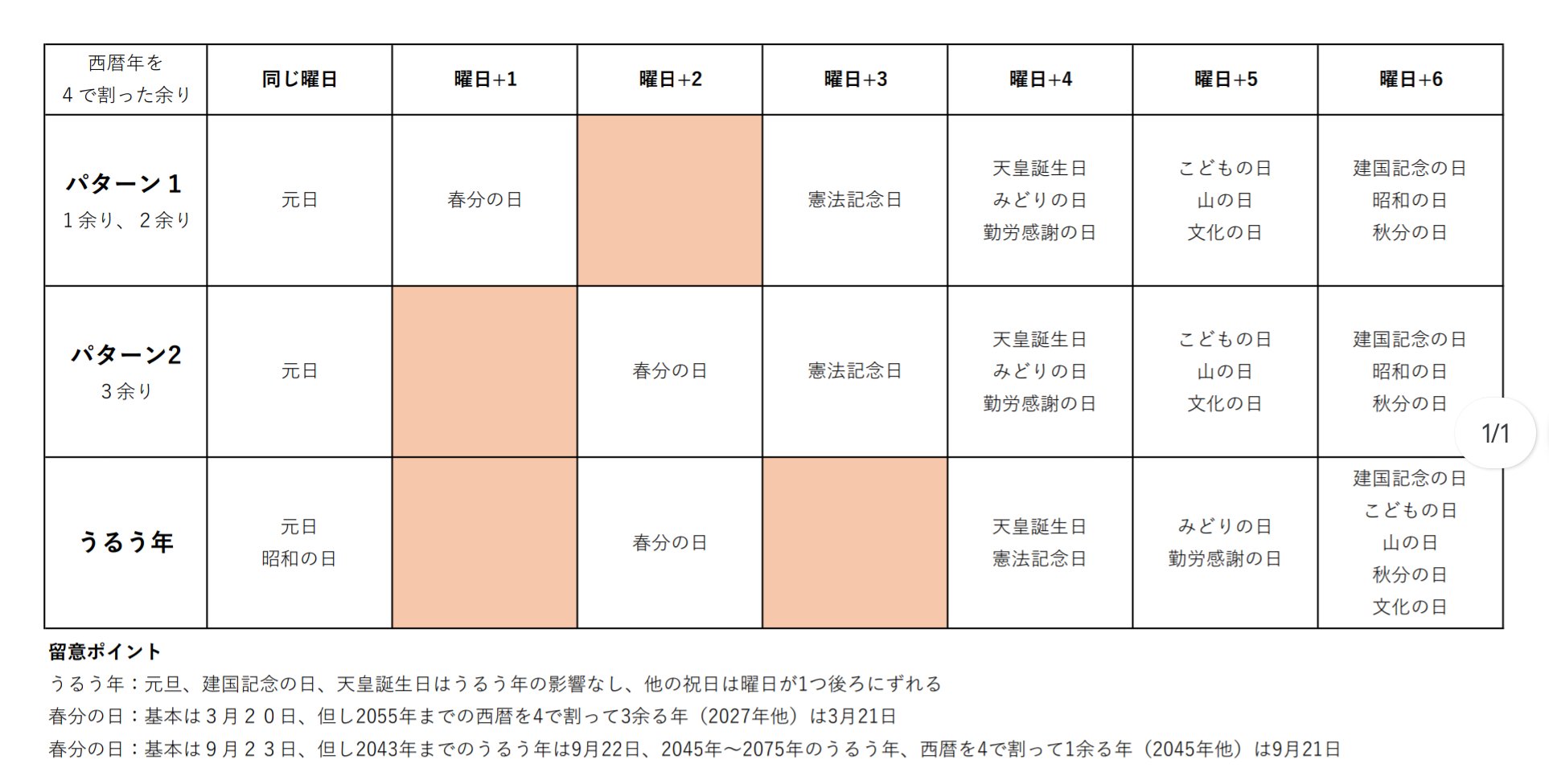 @shikanabe カレンダー関係者として気になっていたのでまとめました。2026年はパターン1で元日が木曜日なので日付指定祝日の土曜日重なりがなかった模様です。多分27年もパータン2の元日金曜日なので重なりないと思います。うるう年で元日が日曜日になると一番きついですね。 https://t.co/1Mqvo62Vnm