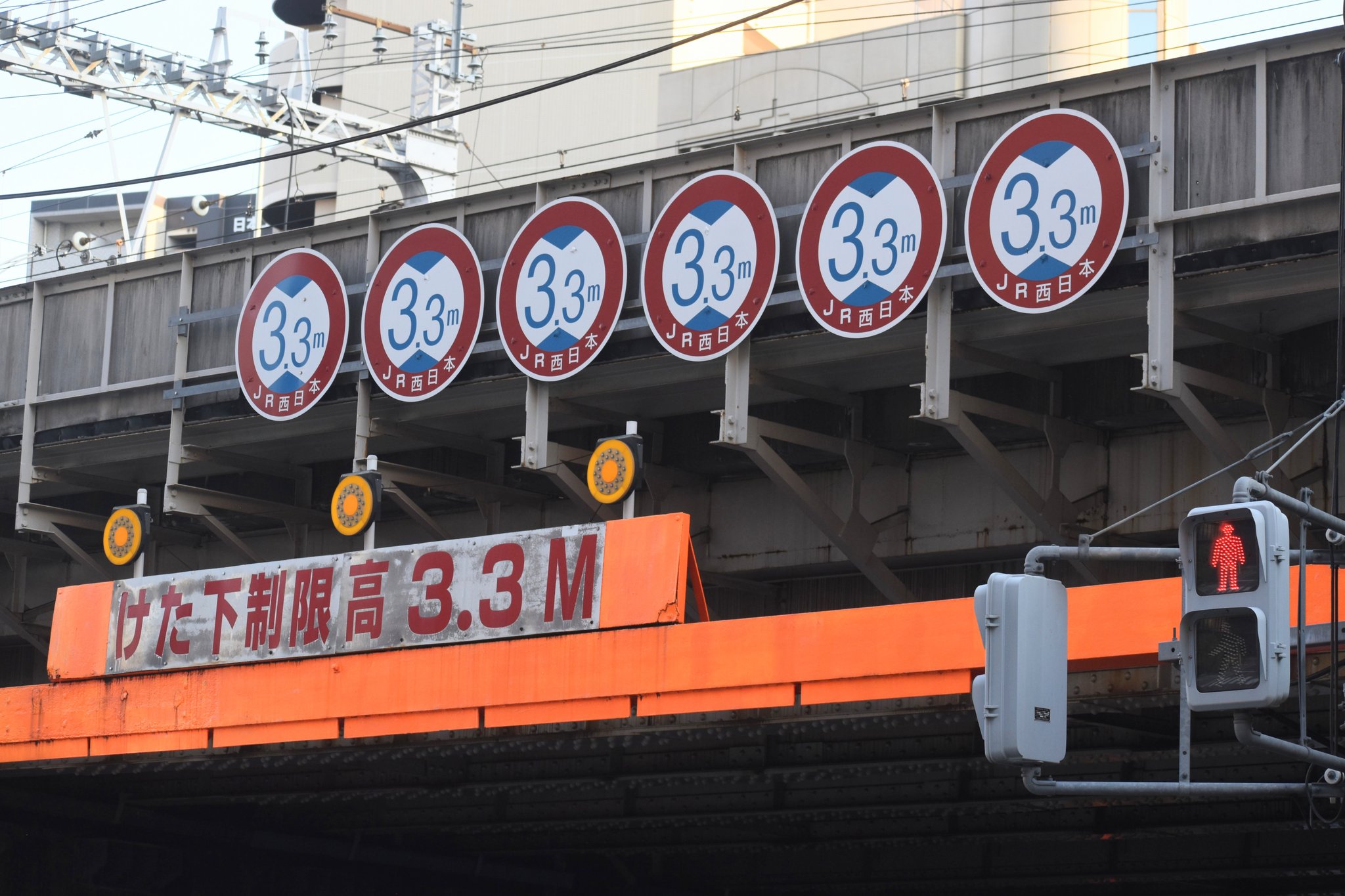 この標識をJR西日本が設置するのは適法だろうか?- ここは大阪市道のはず(たぶんあみだ池筋)- 高さ制限の標識は道路交通法で定められた規制標識である- 規制標識は公安委員会と道路管理者が分担して設置するデザインを変えるなどして法廷の標識と見分けがつくようにする必要があるのでは?