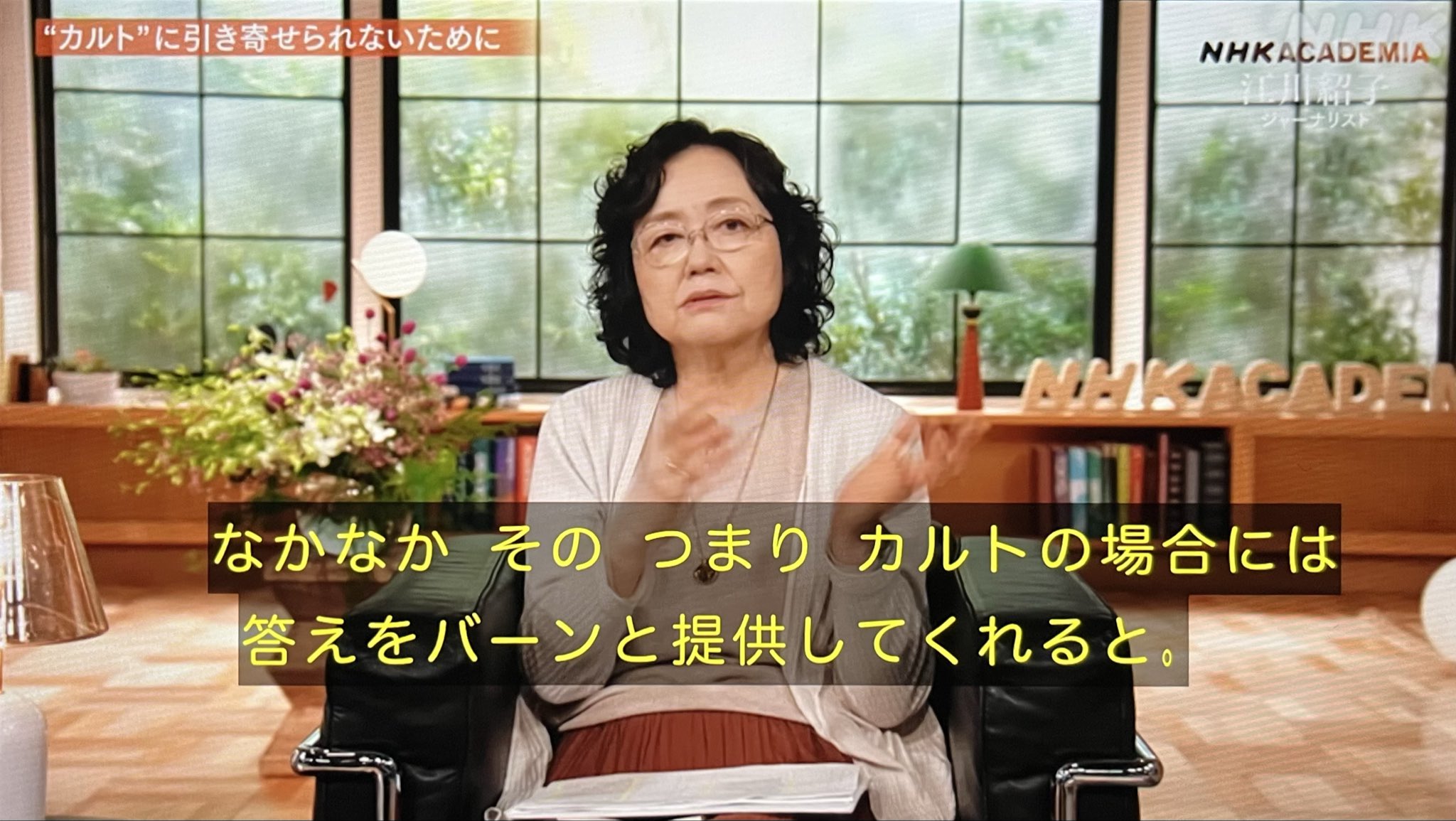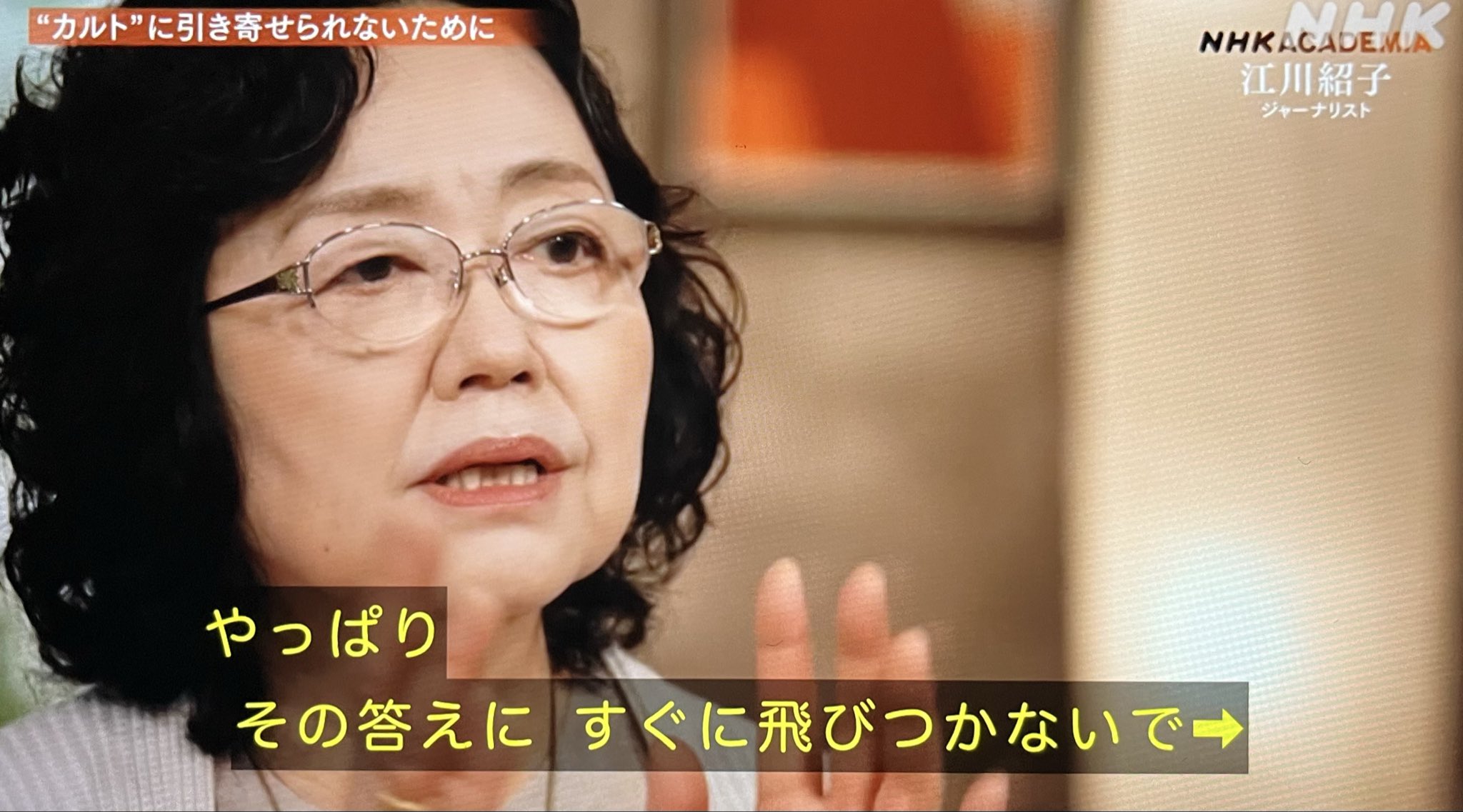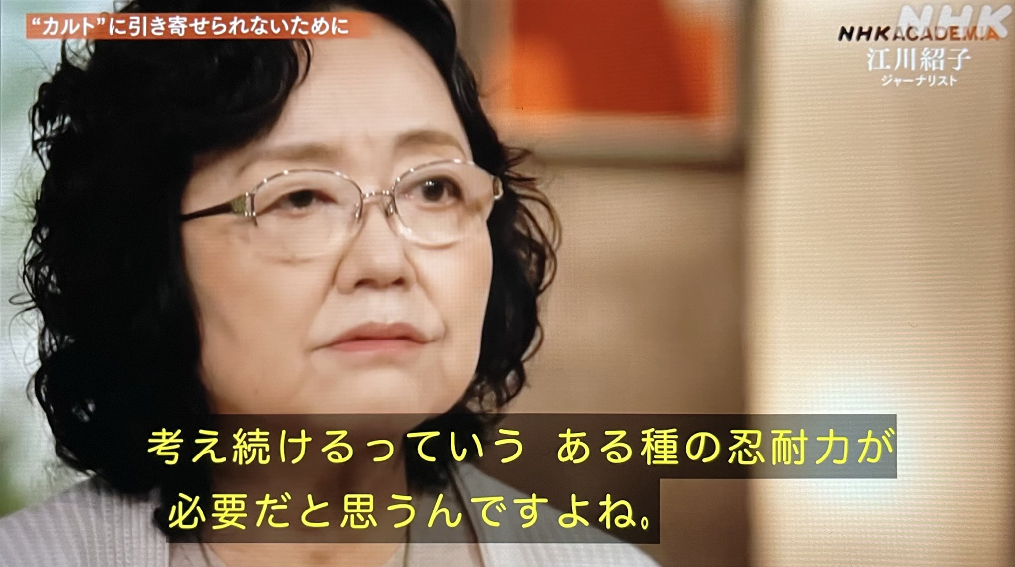 カルトにハマらないためには?江川紹子さん「カルトの場合には、答えをバーンと提供してくれると。だけど、世の中すぐに答えが見つかる問題ばかりではないと。やっぱりその答えに、すぐに飛びつかないで、考え続けるっていう、ある種の忍耐力が必要だと思うんですよね。」 #NHKアカデミア https://t.co/Orn1XZML1e