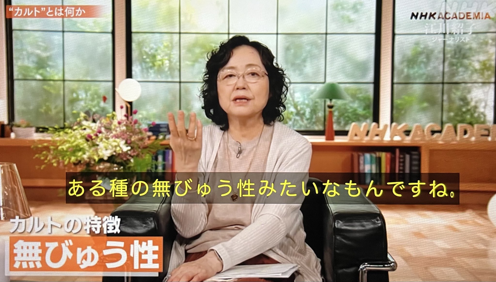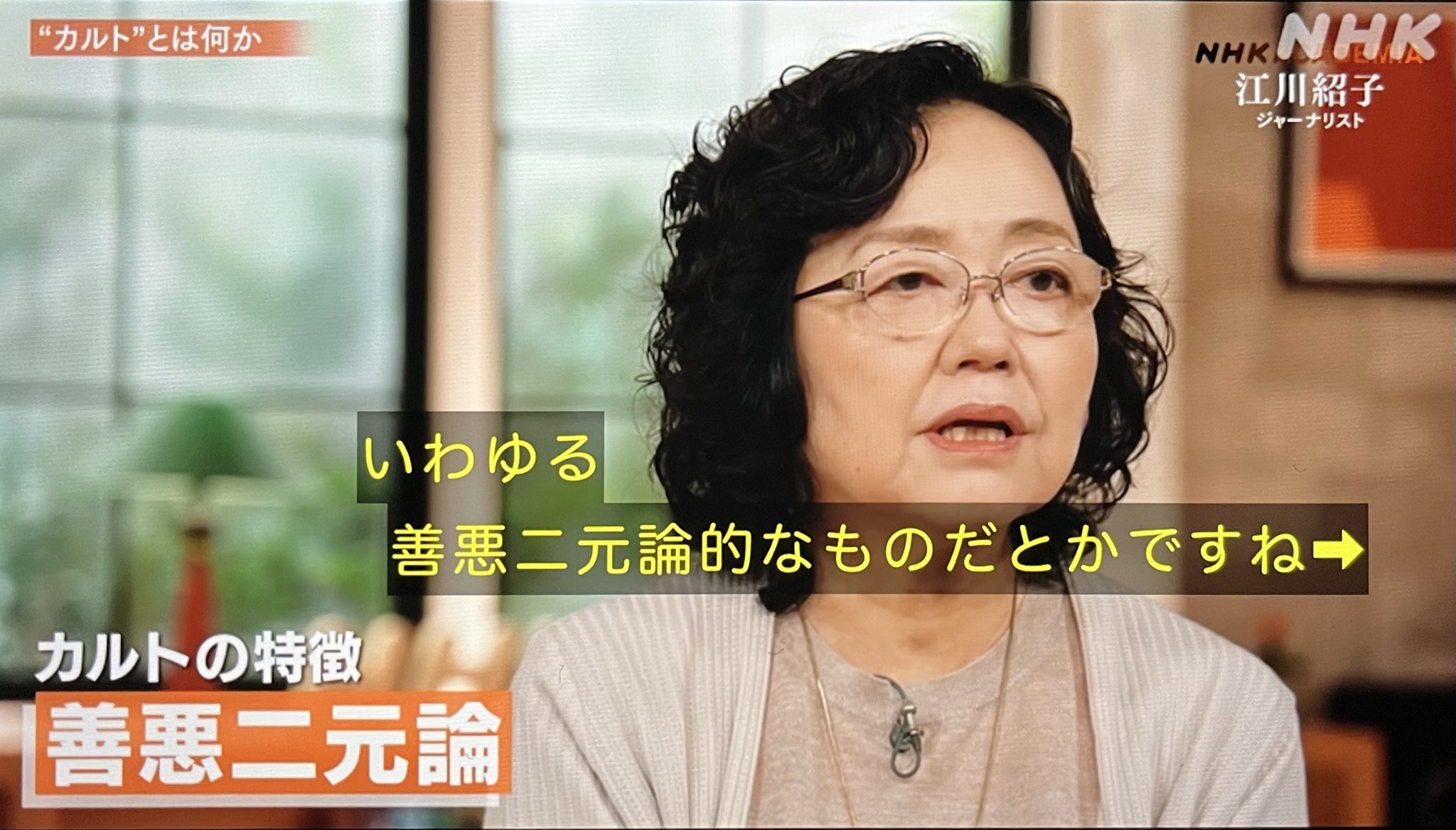 この番組は本当にお勧め。是非NHK+で見て欲しい。カルト的なものは宗教に限らないという話や、米国がイラク戦争の時に善悪二元論を振りかざした話や、坂本堤弁護士一家が失踪した時、当初警察は自発的失踪ではないかと言っていた話など聴くべき内容多数。 #NHKアカデミア https://t.co/cepqkANm2W