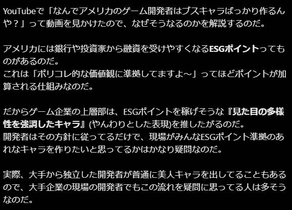 ESGポイント高いクソブス売れないゲーム作るのとESGポイント無視なドチャシコ覇権キャラゲー作るのとアメリカリベラルポリコレ世界的には前者が正答でしたねだから滅びた…