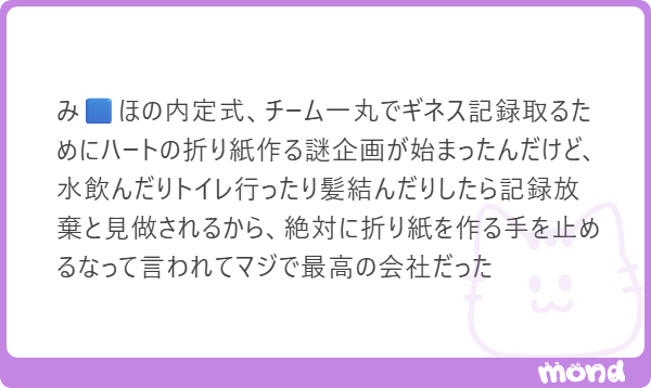 『みずほFGがこの日都内で開いたグループ5社合同の内定式には約1千人が参加し、一斉に折り紙でハートを作った枚数を競うギネス記録に挑戦した。内定者が同じ作業に取り組むことでつながりを深めてもらい、「入社の決意を新たにしてもらう」(広報)狙いがあるという。』https://t.co/1ivqz7kKLo