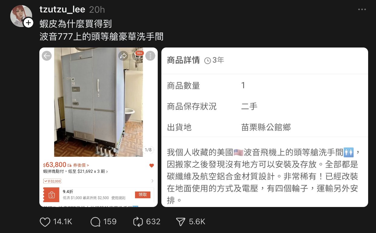 台湾のとある飛行機オタクなら、飛行機のトイレを持ってます。※画像はオークションサイト、引っ越しのため、置く場所なくなったのため売る、地面用に改装済み https://t.co/rIkOdbl2ed