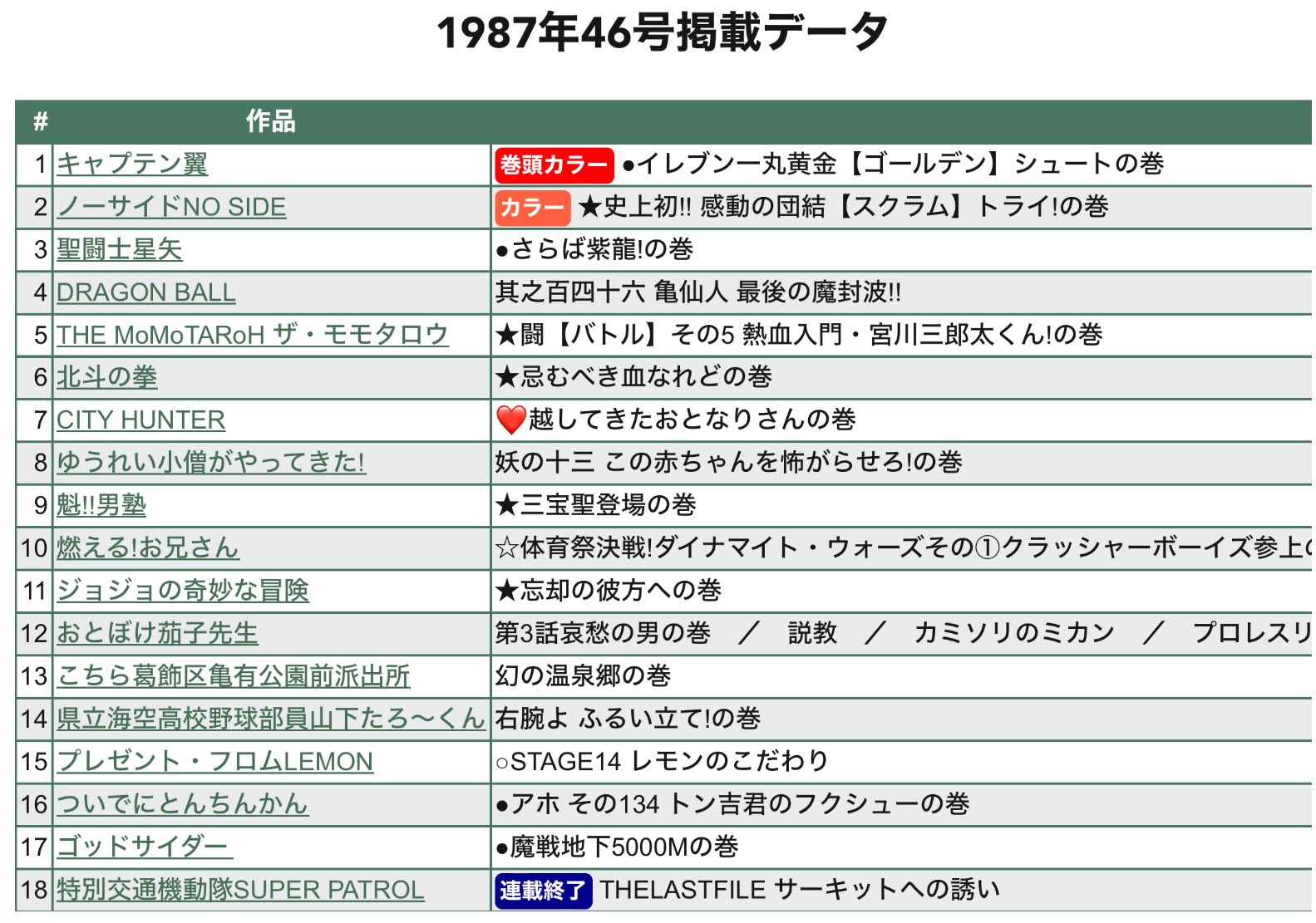 週間少年ジャンプ1987年46号の連載陣豪華だわ〜ドラゴンボールがちょうどピッコロ大魔王戦だわ https://t.co/2l2e76MXFK