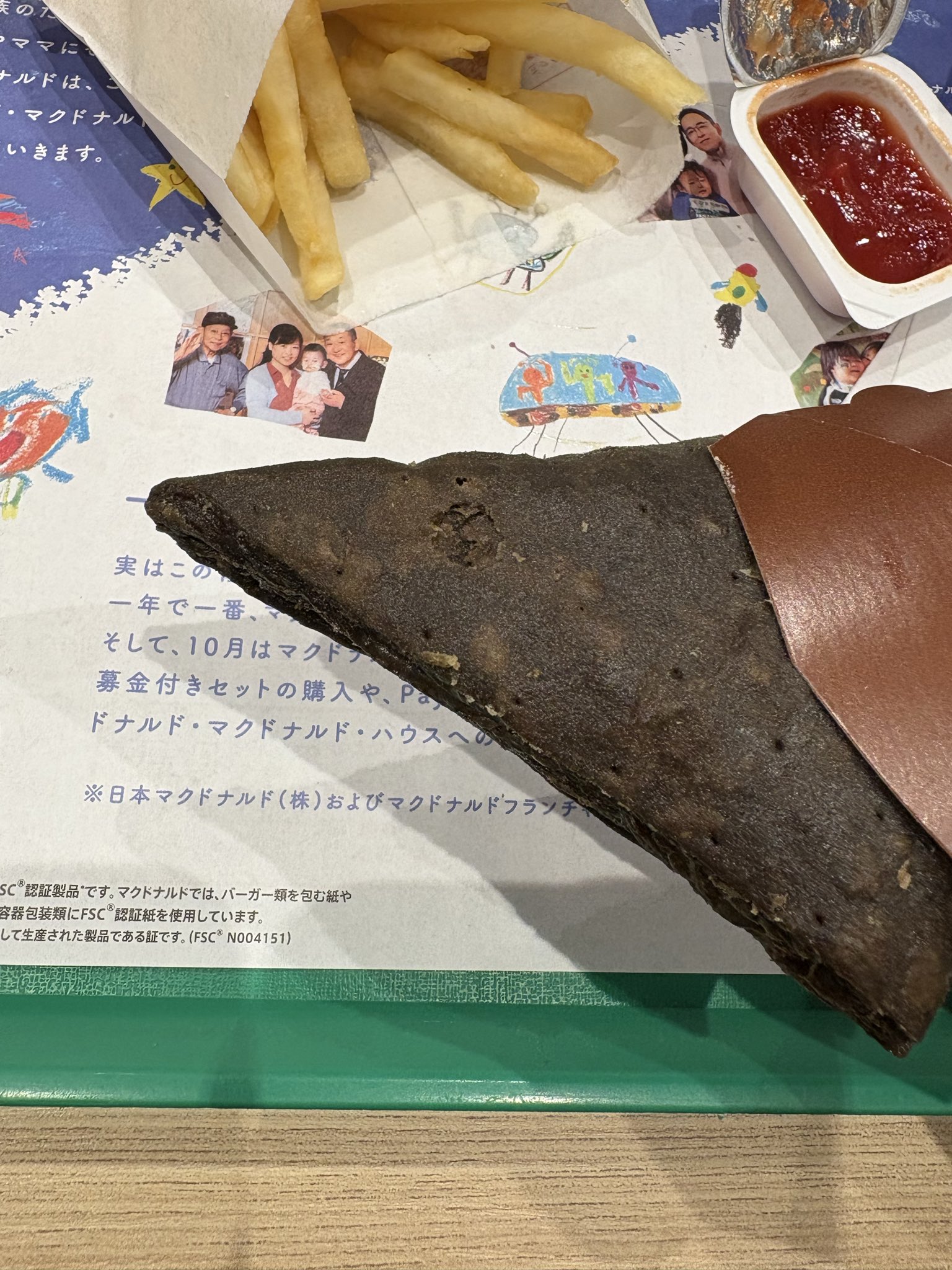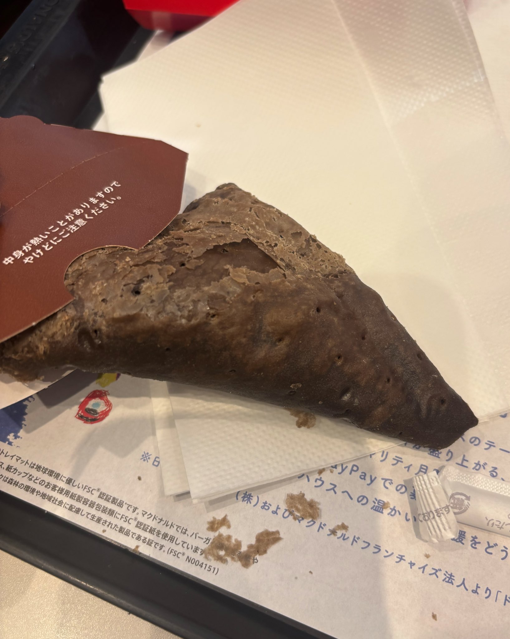 これ解説すると、三角チョコパイ揚げた後にパイ用バケットから力づくで取り出すと外皮が剥がれてツルツルになります若しくは、冷凍パイを一回溶かしてしまうと外皮が上手く付かなかったりしますつまり、クルーのオペレーションが悪いです