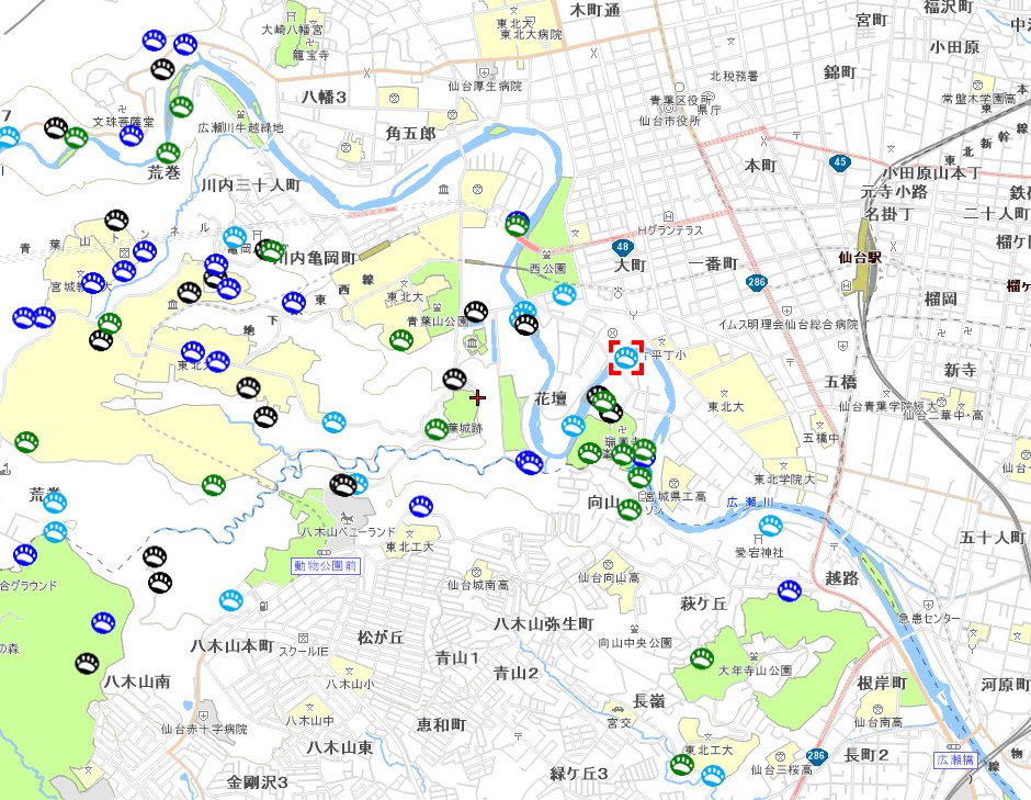 ここだけ切り取ると熊が街中に?!となるけど、仙台在住の人には、出て当然の場所なんだよね🤔熊は川沿いに移動するけど、この上流は熊ヶ根とか作並とかに繋がるから、熊が居ても不思議で無い。本当にすぐ近くに野生の鹿が出るスポットもあるし🦌
