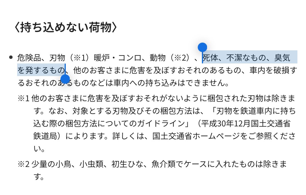 @enjoybassfish ビニール袋や発泡スチロールに入っていないだけで危険だったり異常だったりはしていないと思います臭いが付きそうなので車掌さんや清掃する人が困る訳ですが