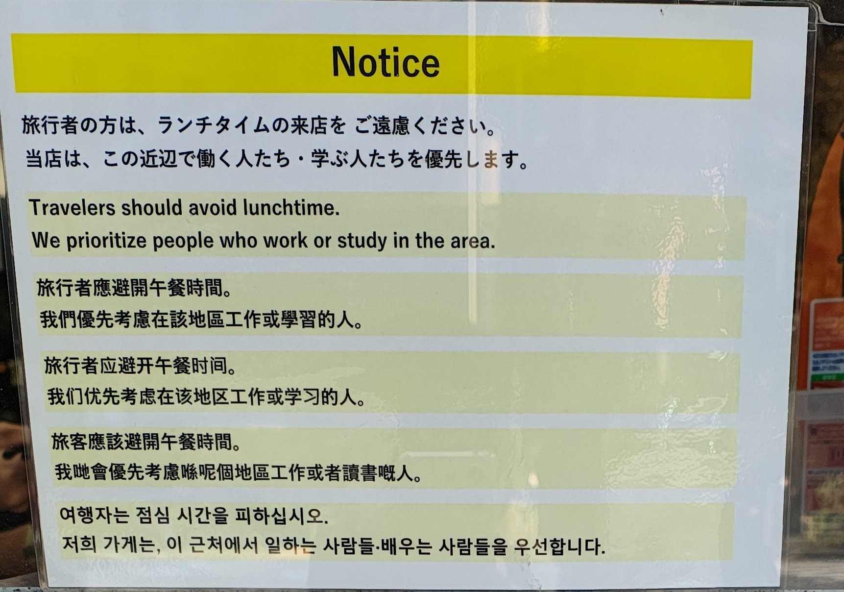 @yu_l09 今日本に来てる旅行者ってお金がないから地元の名店じゃなくて格安のチェーン店にしか行けないんだよね。そのくせマナー悪いし店員の女の子を無料キャバクラ扱いするから迷惑でしかない。富士そばの対応は素晴らしいと思う。従業員の働きやすさのためにも他のお店も続いてほしい。