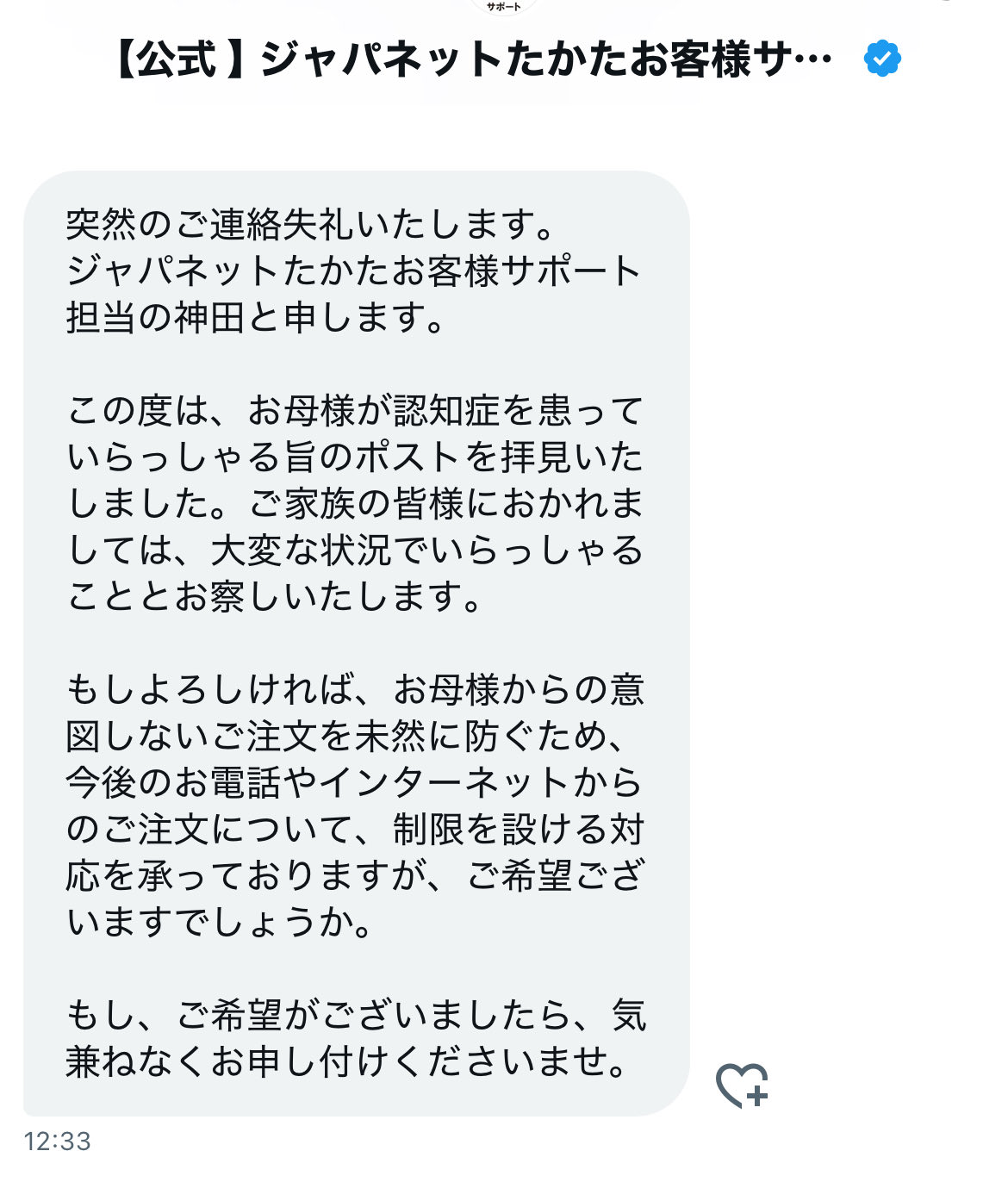 「これは素晴らしい…」家族が認知症だとポストしたXユーザーに対する『ジャパネットたかた』のDMが話題に😳