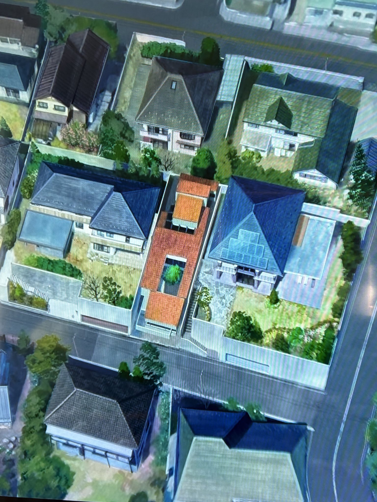 主人公の家は、屋根の色が暖色がち。引きの映像でも、主人公の家がどれか分かる必要があるから。は見てたけど、建ぺい率でも他の家と差別化しだしたか😂
