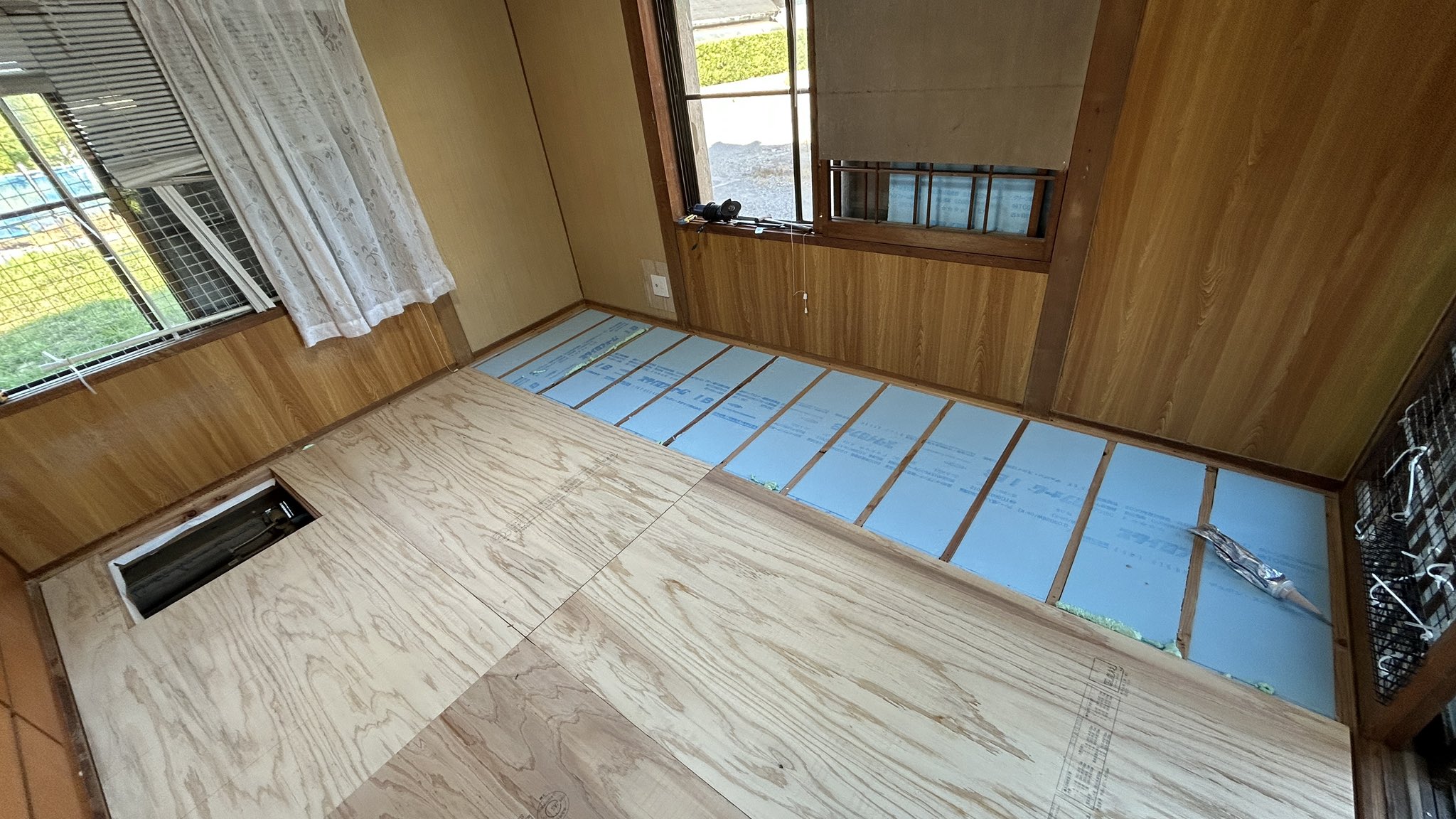 こ、これで完成…?!畳下地張り替えた方がいいよカビてるよ…根太はそれでいいんか…床板の端に当たってない?断熱材入れないんか…隙間があるけど…12mmベニヤ貼ってる?撓むぜよ…虫もつくし水が染み込むしささくれ出るしなんで床材買わないの…巾木もない…人に貸す?!