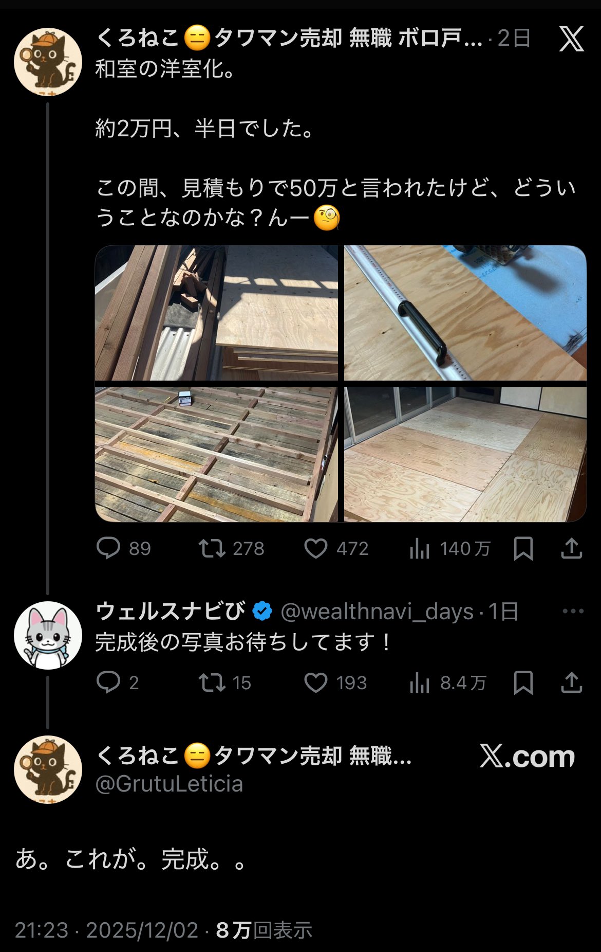 — くろねこ😑タワマン売却 無職 ボロ戸建てDIY (GrutuLeticia) 2025年12月01日