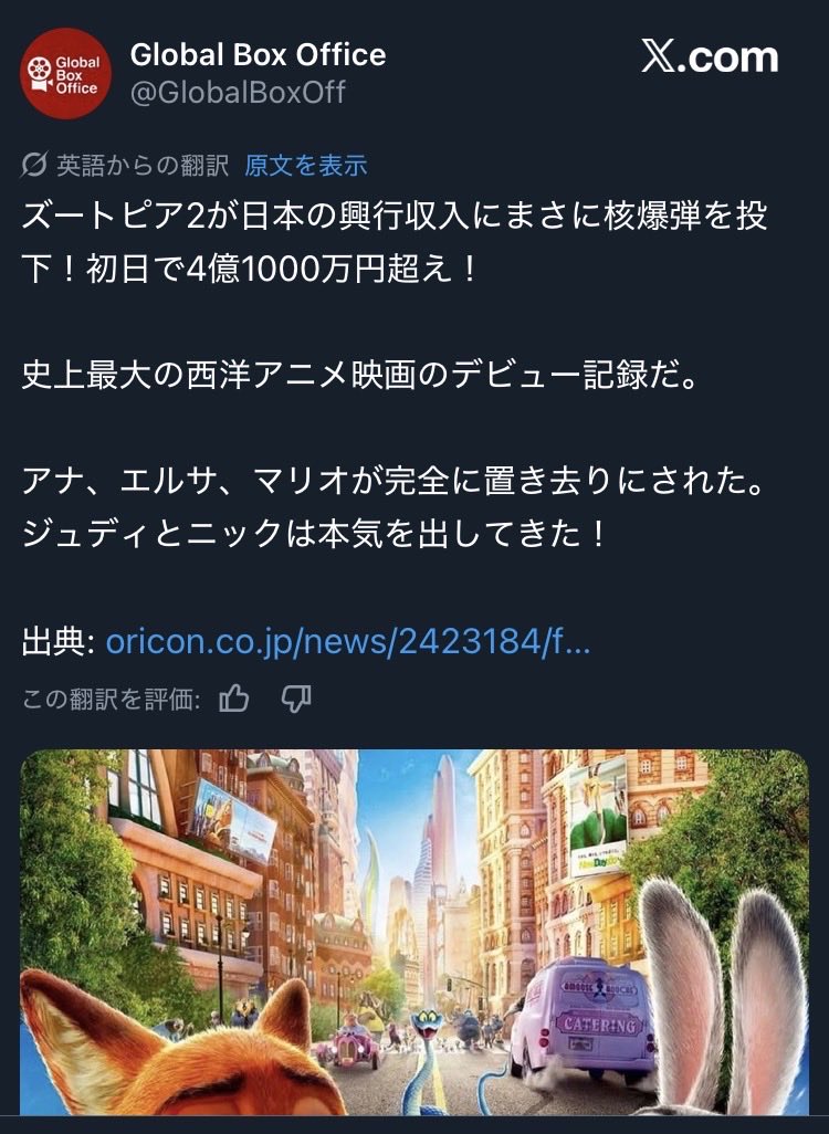 @GlobalBoxOff 大好きなズートピアの続編の、日本における興行収入を語る際にNUKEを持ち出すのはやめてください😭日本にもズートピアのファンがたくさんいて、だからこそ生まれた興行収入です私たちの国では原爆で多くの人が亡くなりました私の祖父母が暮らす街に原爆は落とされました