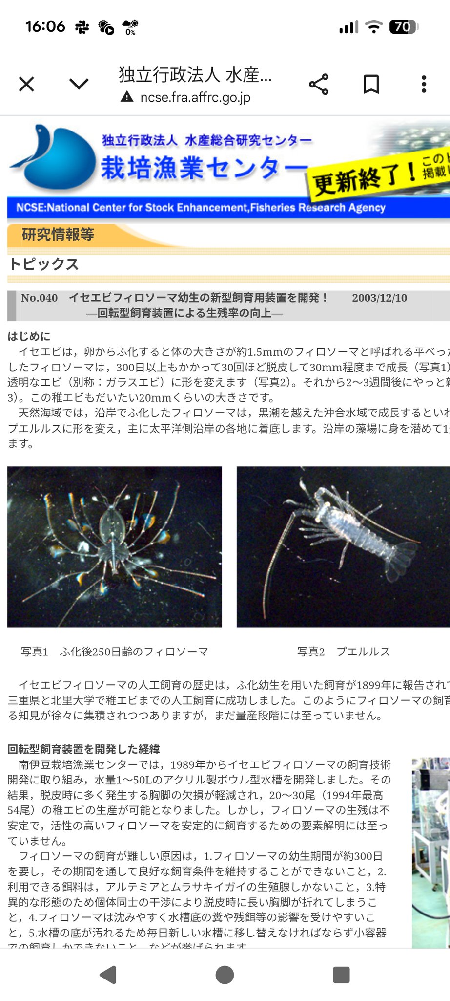 @no_prettymama フィロソーマ幼生というイセエビの赤ちゃんですね。三重県の水産研究所が長年の研究の末、卵から稚エビへ育てる試みを成功させていますが、コスト面の問題から完全養殖への道のりはまだ長いとされています。https://t.co/yylBUAMhP6